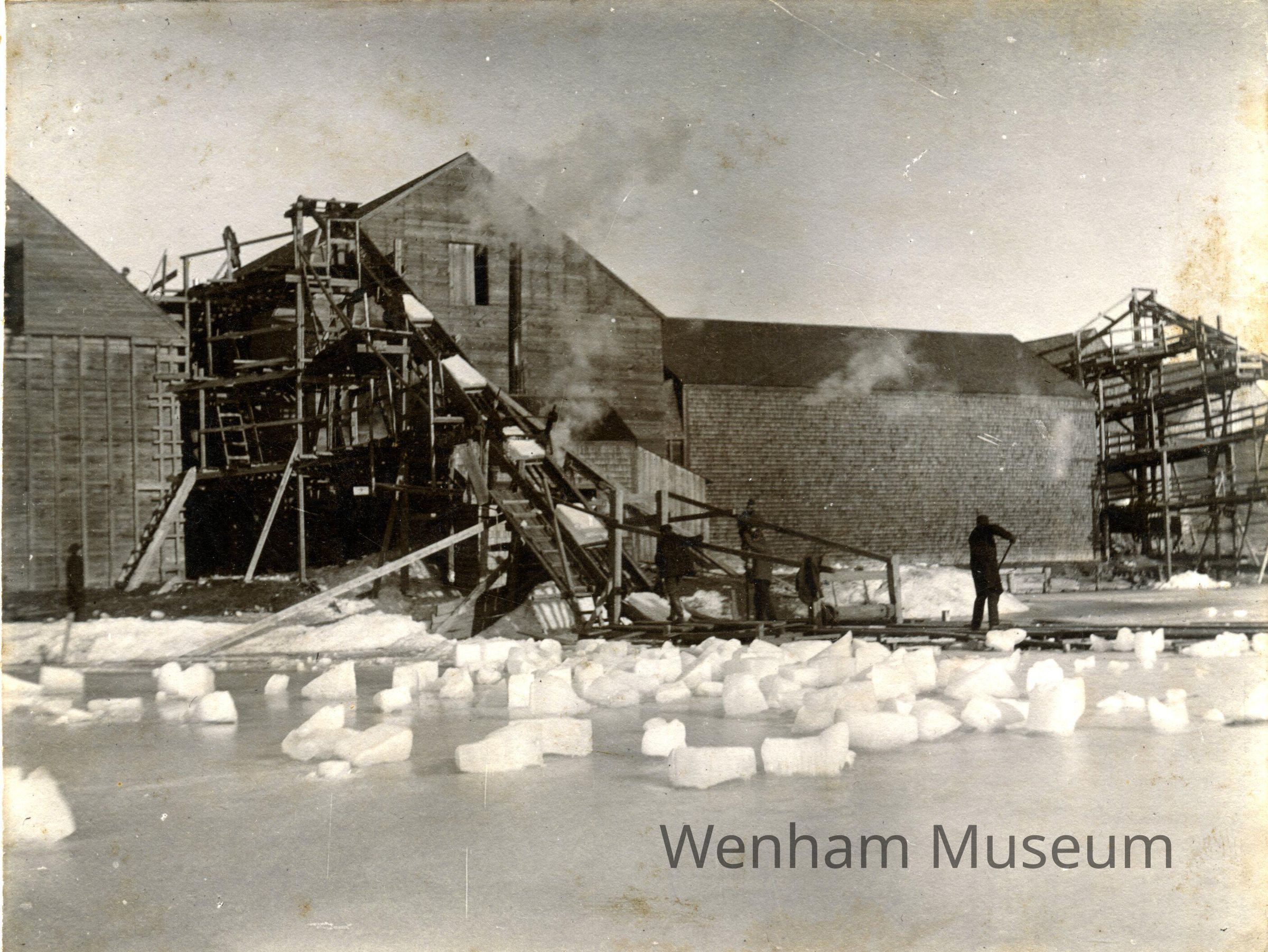 Mounted print, of ice being cut at Wenham Lake, back of print: Smith-Julian Ice Houses / Wenham Lake."