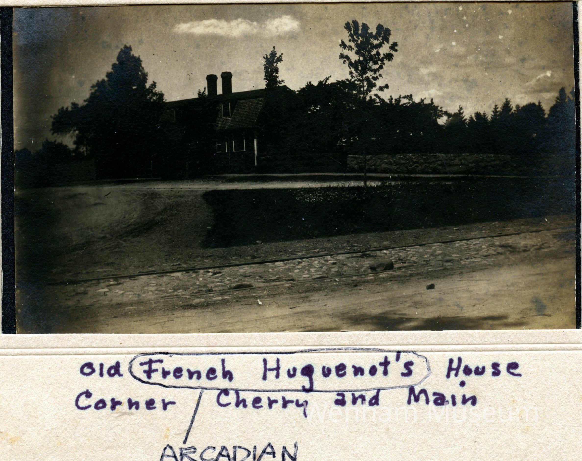 Two mounted prints, "Old French Huguenot's (Arcadian) House / Corner of Cherry and Main" and a Fox Hunt with horses and hounds labeled: "View looking East up / Cherry St. from near / Cedar St., Wenham.