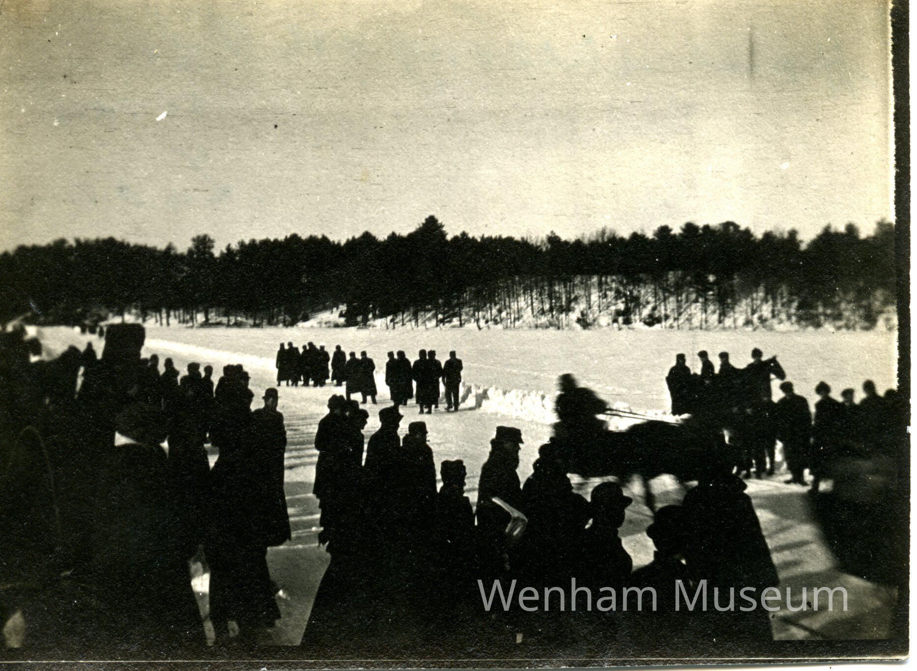 Print, 3 x 2.25," of horse racing on Idlewood Lake, winter, Wenham, MA.
