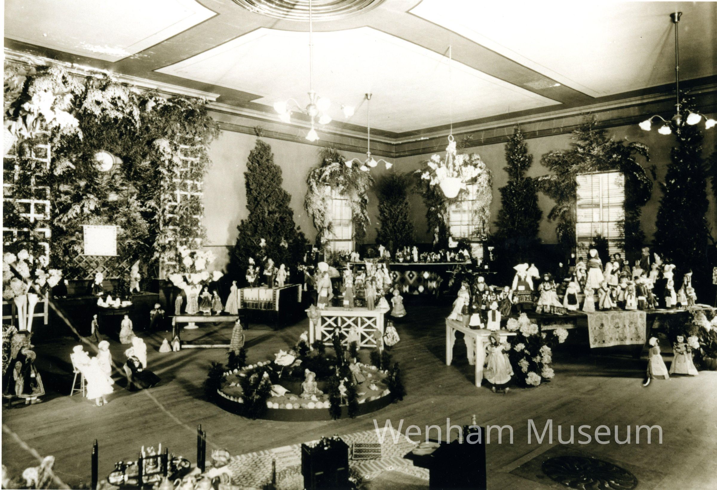 Black and white photographs of First Doll Exhibition at Wenham Town Hall, August 1922.