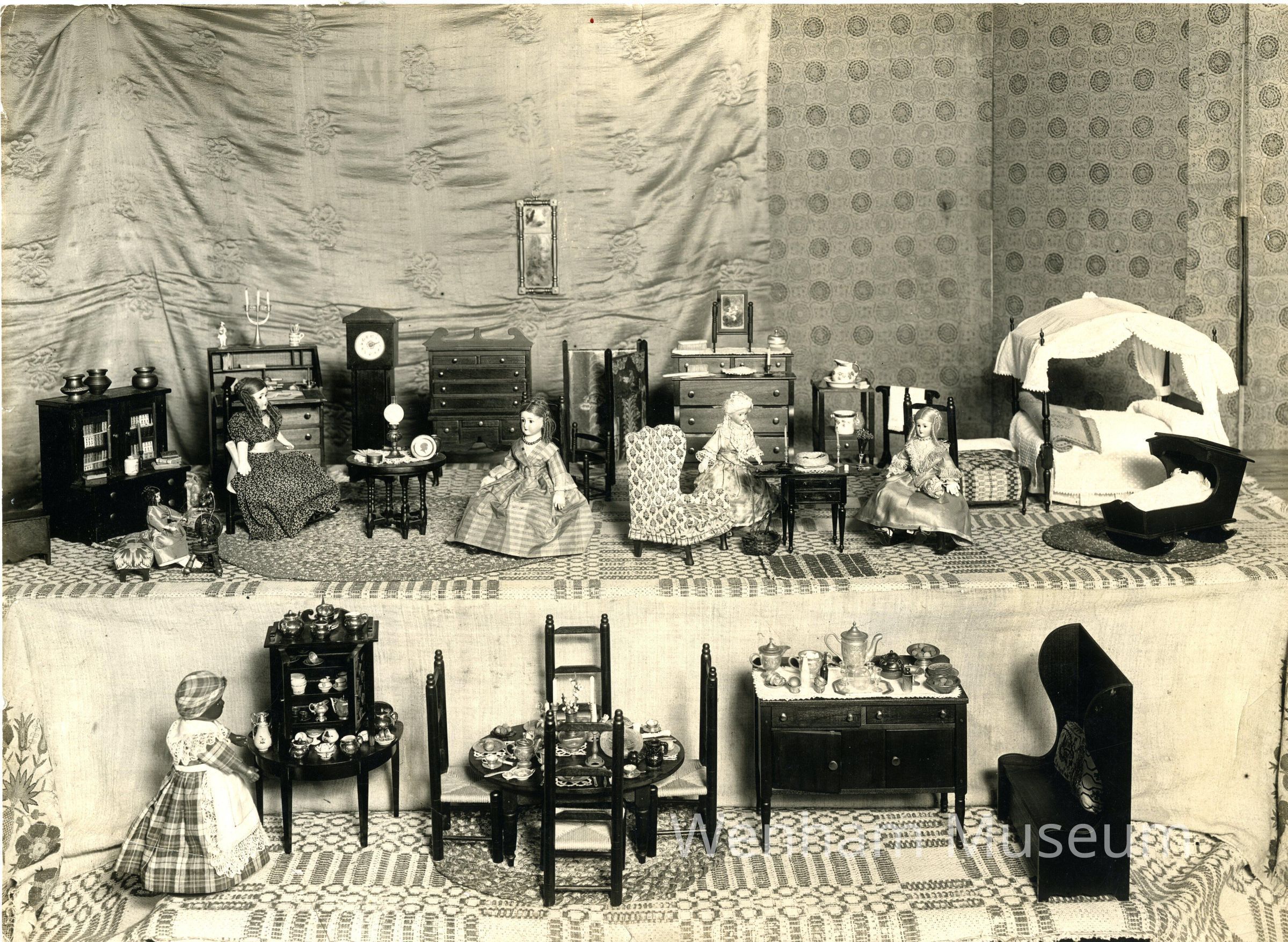 Black and white photo: "Miniature Furniture and doll collection-picture taken in Wenham-August-1922"
