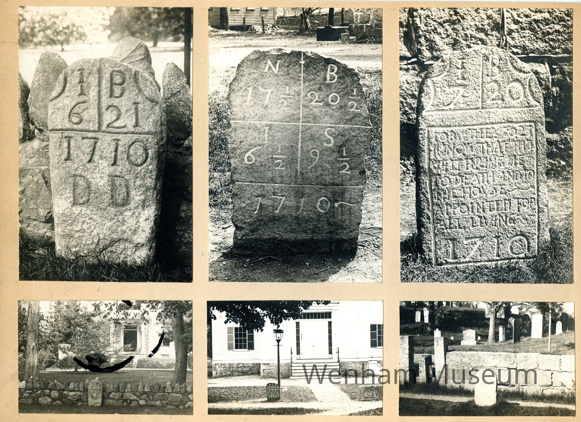 Six photographs mounted on cardboard of milestones in Wenham. A close-up of each stone and a photograph in situ.