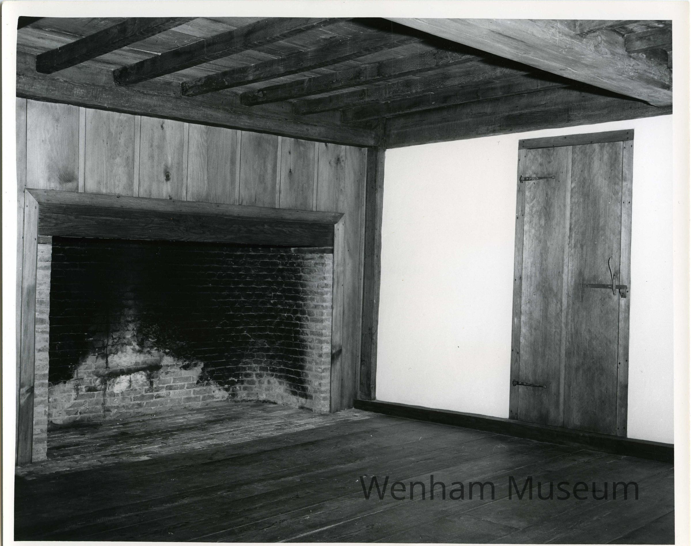 Verso of photo reads: "Claflin Richards [Claflin-Gerrish-Richards] House, Wenham / Restoration of Gerrish Room 1954 / Photograph / By / Zaharis / 54 Central St. Ipswich, Mass. / #54-47" Photo of fireplace and to its right a door.