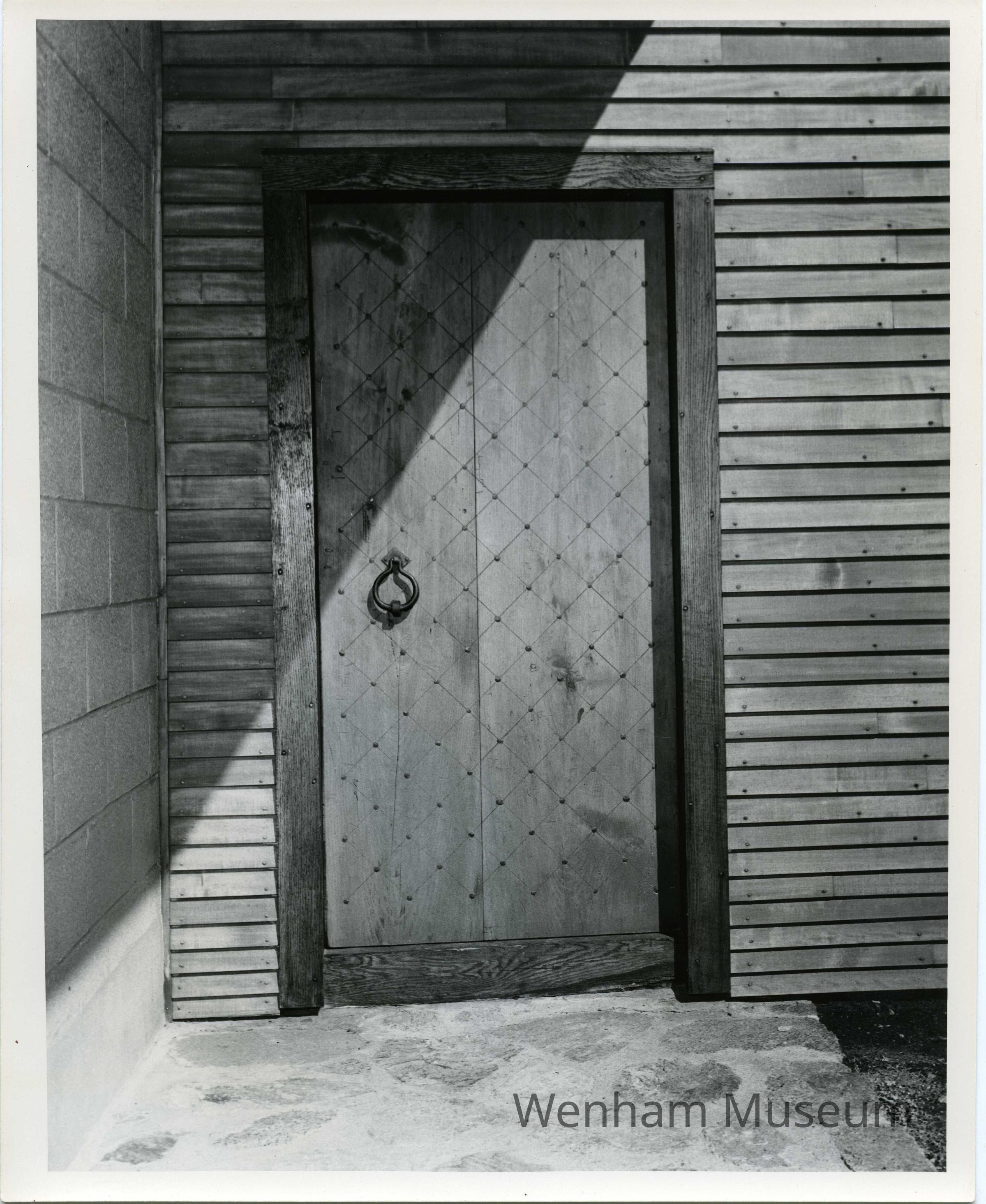 Photo of and exterior door with knocker; note verso reads: "Claflin-Richards [Claflin-Gerrish-Richards] House-Wenham / Restoration of Gerrish Room 1954 / Photography by Zaharis / 54 Central St. Ipswich, Mass. / # 54-51."