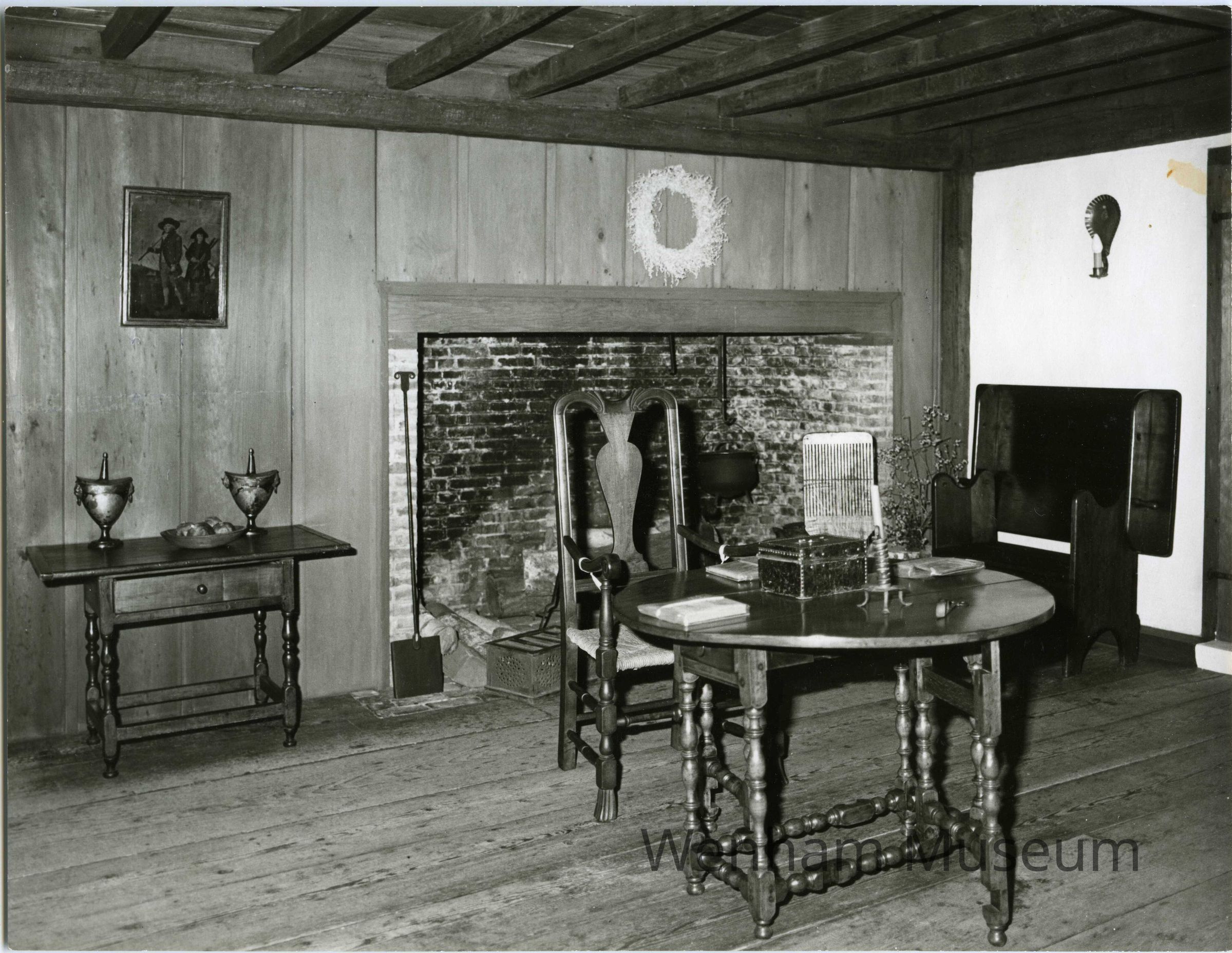 Verso of photo reads: "The Gerrish Room of the / Claflin-Richards [Claflin-Gerrish-Richards] House at / the Wenham Museum." Objects in photo include a chair, table, sideboard, and bench. Behind the chair and table is a fireplace with cooking utensils.