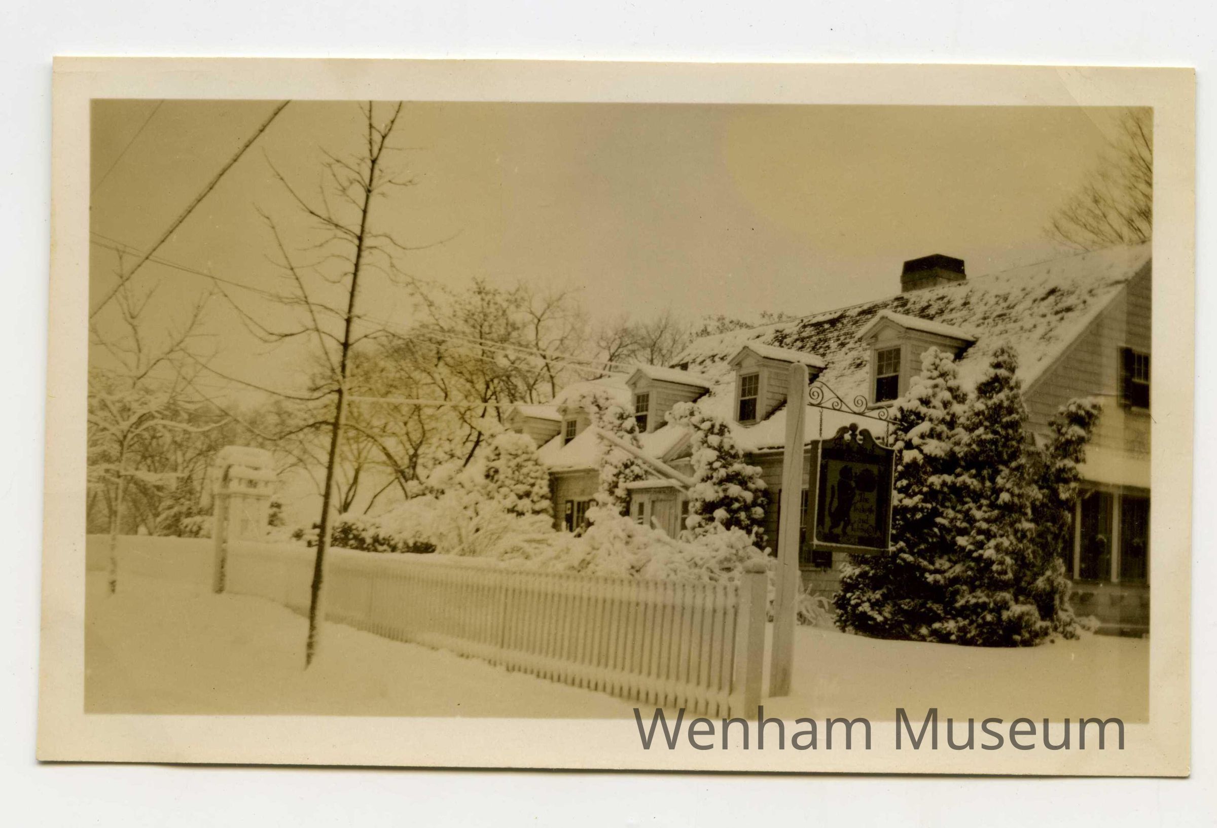A winter photograph of the Wenham Tea House. The meeting house of the Village Improvement Society.