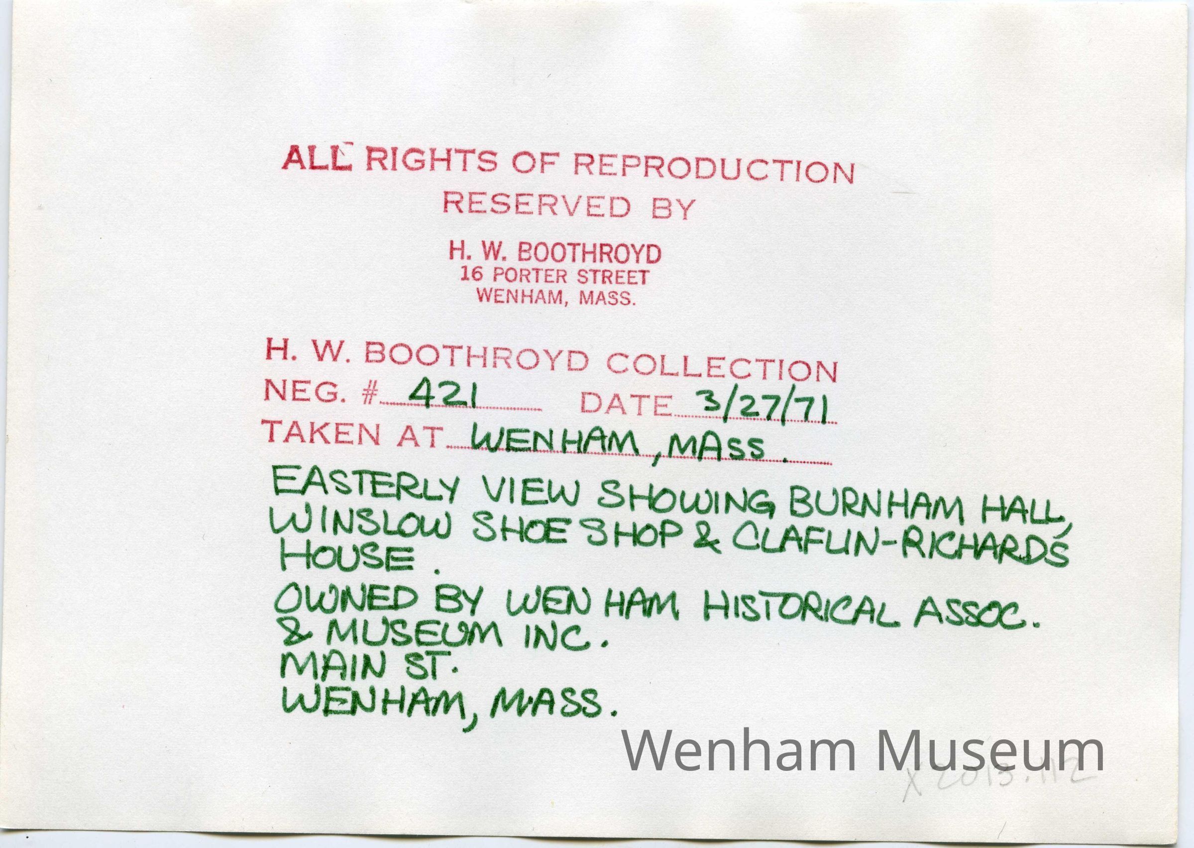Reproduction photo by H.W. Boothroyd of negative 421 on 3/27/71 taken at Wenham, MA. Verso caption reads: "Easterly view showing Burnham Hall, / Winslow Shoe Shop & Claflin-Richards [Claflin-Gerrish-Richards] / House. / Owned by Wenham Historical Assoc. / & Museum Inc. / Main St. / Wenham, Mass."
