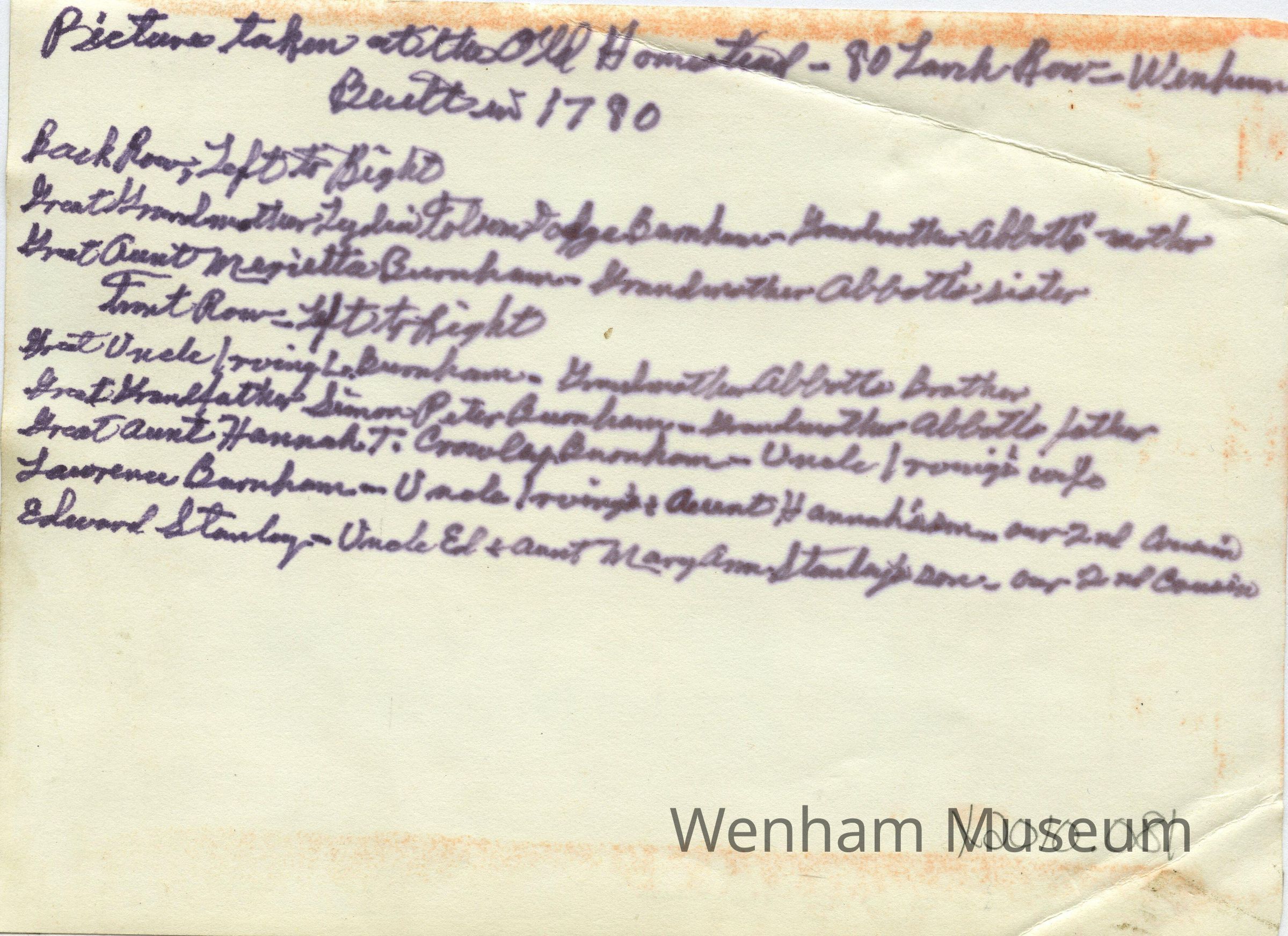 Black and white photograph of 80 Larch Row, Wenham. Pictured from left to right: Lydia Folsom Dodge Burnham, Merietta Burnham, Irving L. Burnham, Simon P. Burnham, Hannah T. Crowley Burnham, Lawrence Burnham, and Edward Stanley.Collection