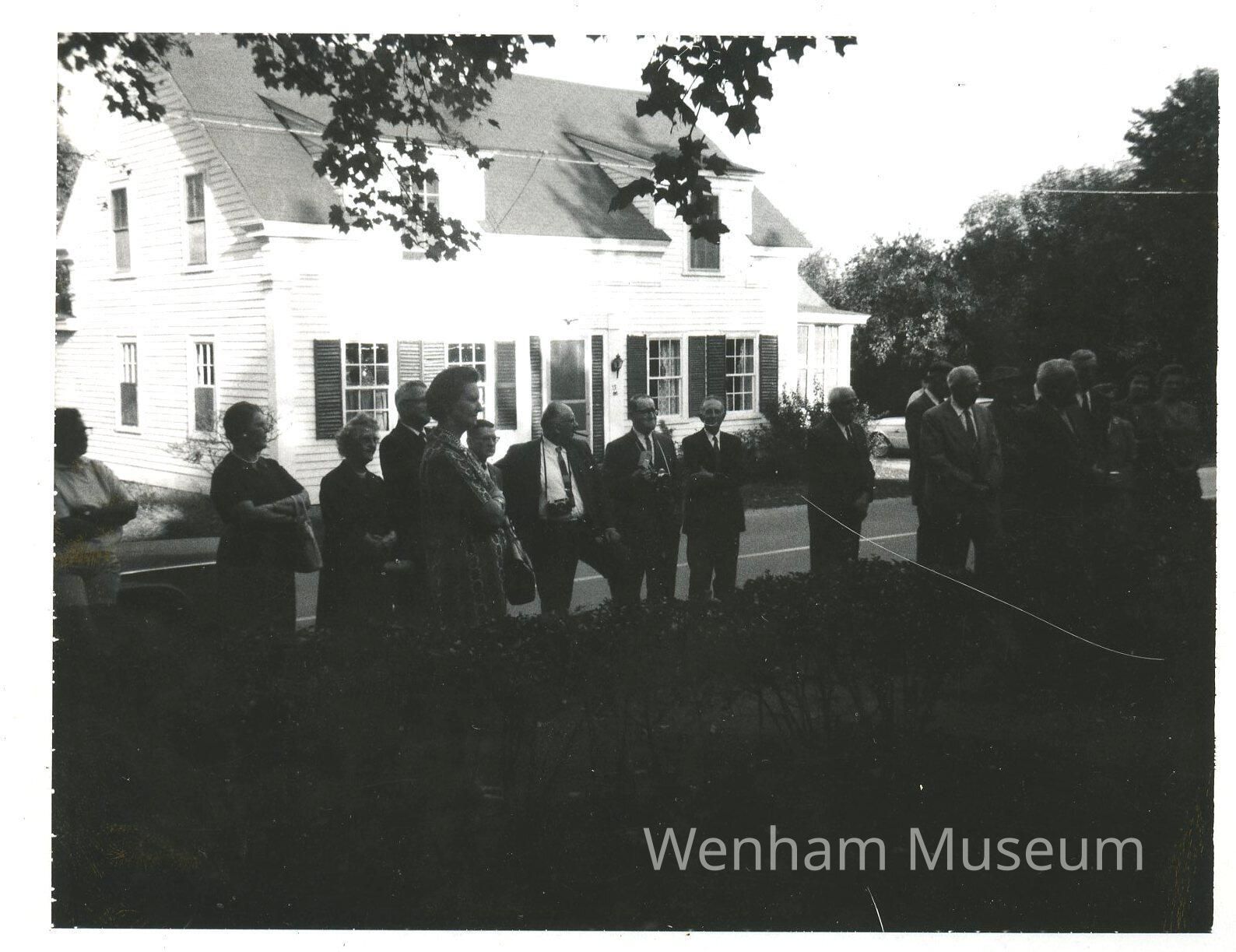 Black and white photograph of ceremonial speaker and crowd attending dedication ceremony of the plaque honoring Henry Alley at 14 Larch Row, Wenham.Collection