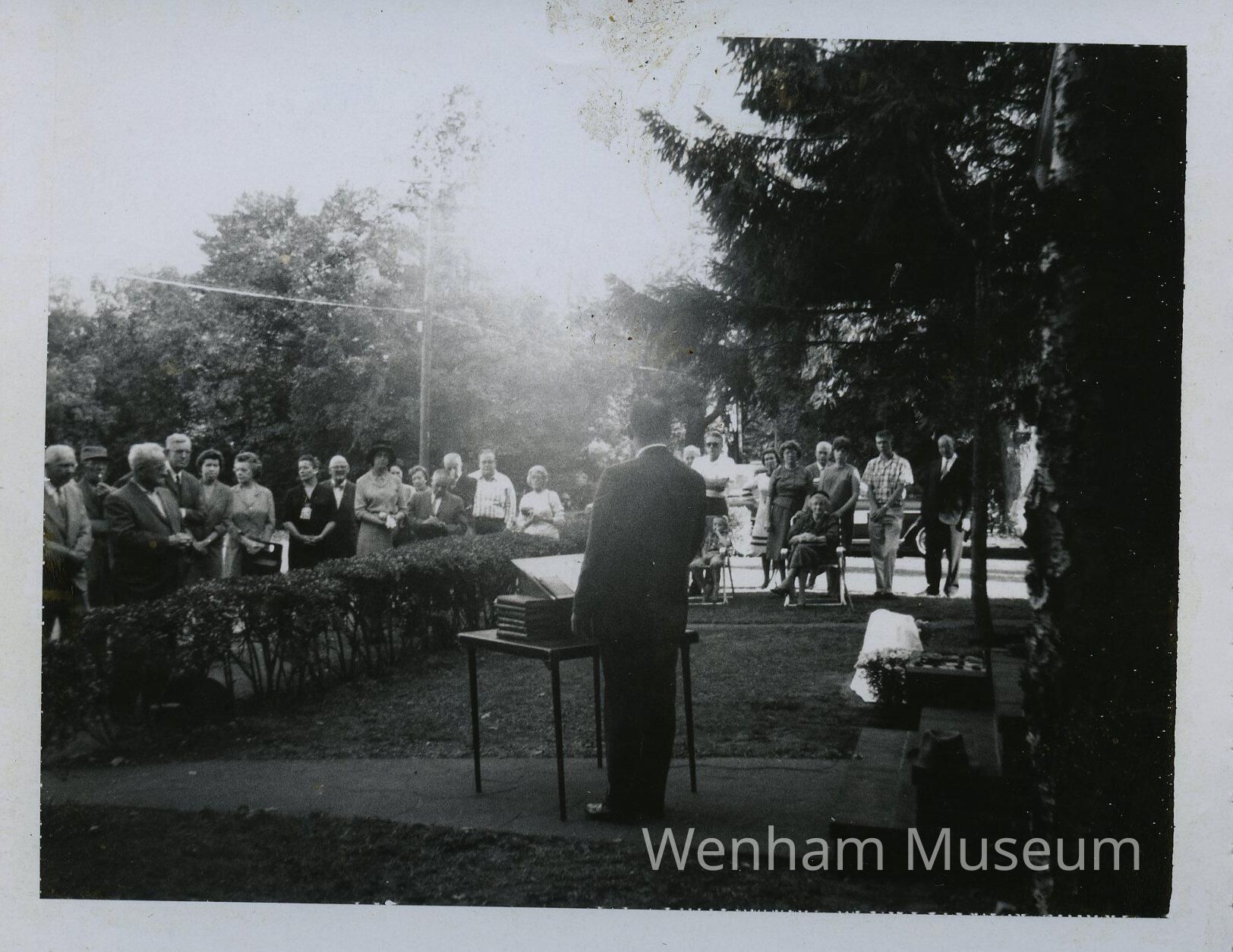Black and white photograph of crowd attending the ceremony of the dedication of the plaque in honor of Henry Alley. Plaque location, 14 Larch Row, Wenham.Collection