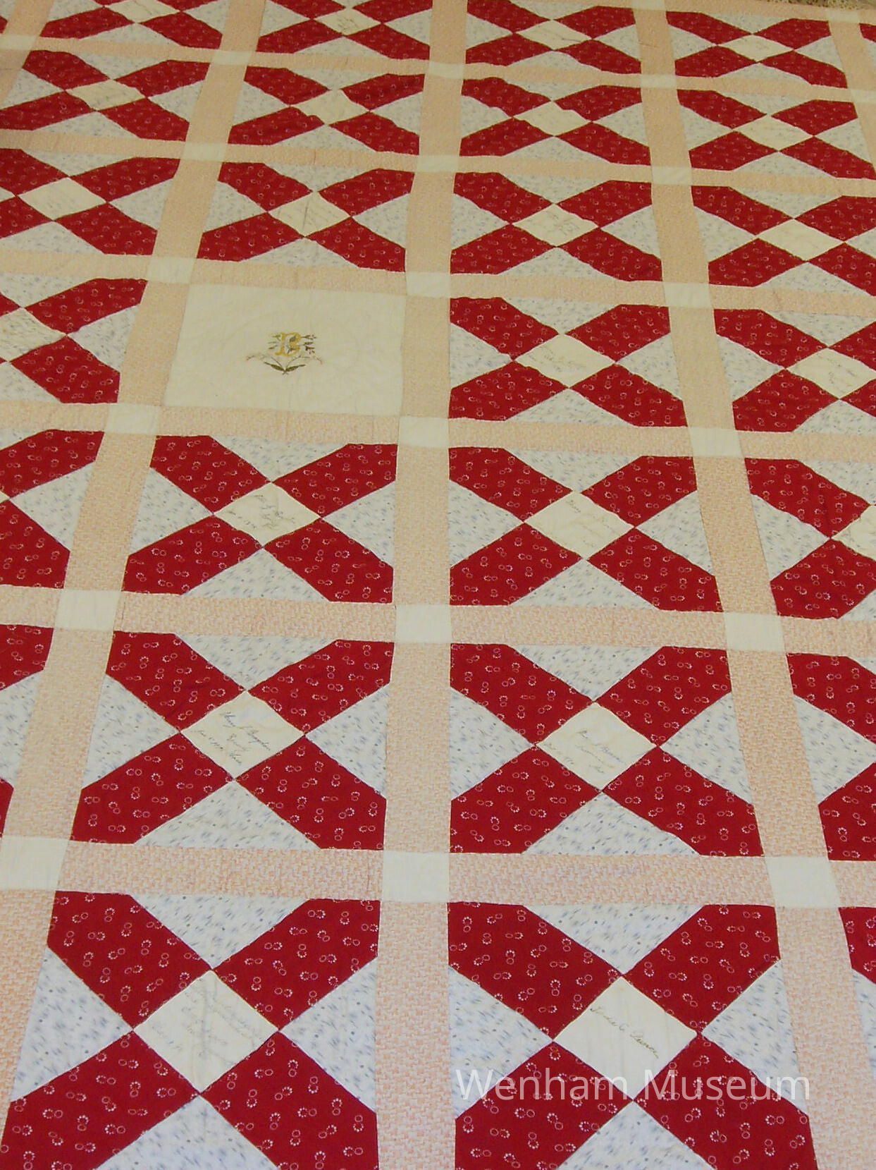 Signature or conversation quilt featuring several families from Wenham, MA as well as several other states, in the Snowflake/Old Italian pattern, made from multiple prints: red on white ground; blue on white ground; orange on white ground vermicular. Centers of crosses are plain muslin squares which have been signed in ink, some with captions or rhymed couplets, dates range from 1893 to 1904. Center square has an embroidered monogram, "B," and a spray of yellow flowers with green leaves and stems, with a circle around it in quilting stitches. Backing is pink with black and white, and pink, white and black stripes.