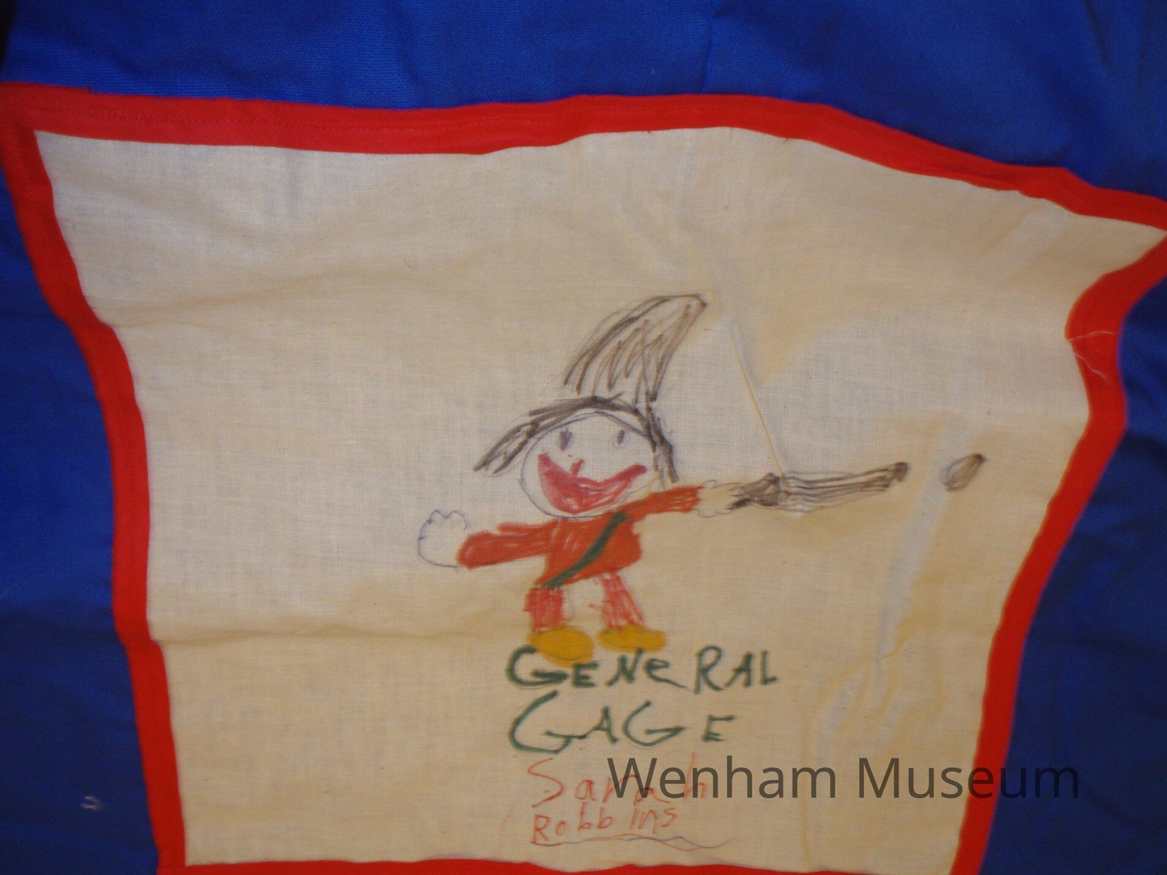Quilt made by a multi-age group (1st and 2nd grade) from Bessie Buker School, Wenham as a bicentennial project in 1976. The group's teacher was Patty Berry and the quilt depicts Revolutionary scenes. Made of blue cotton polyester, featuring 22 muslin squares with fabric paint by children. Commercial bias binding, applique on blue fabric. Back is muslin, edge bound with gingham ribbon. Blue tabs on the top to hang it.