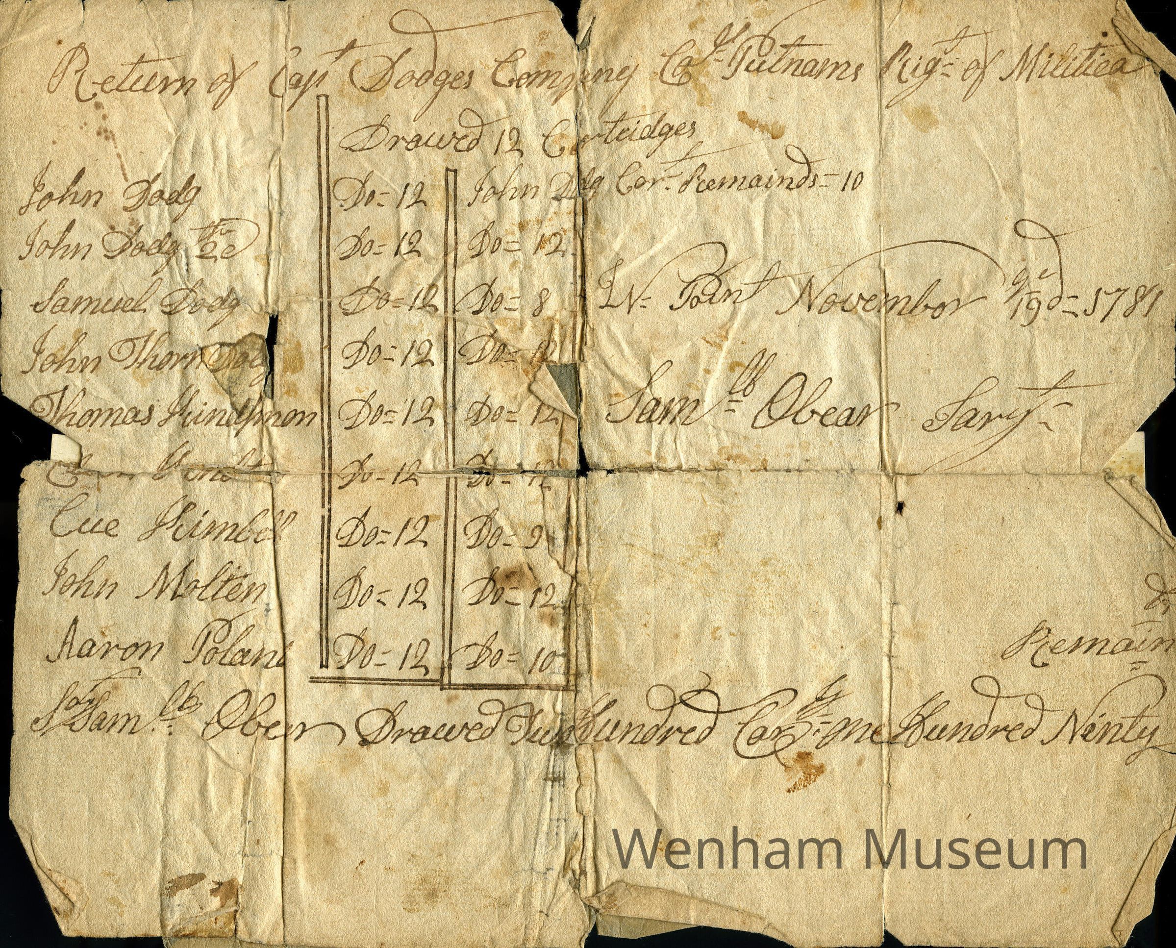 Papers pertaining to the number of cartridges used by Captain Dodge's company, compiled upon his return. Dated November of 1781.