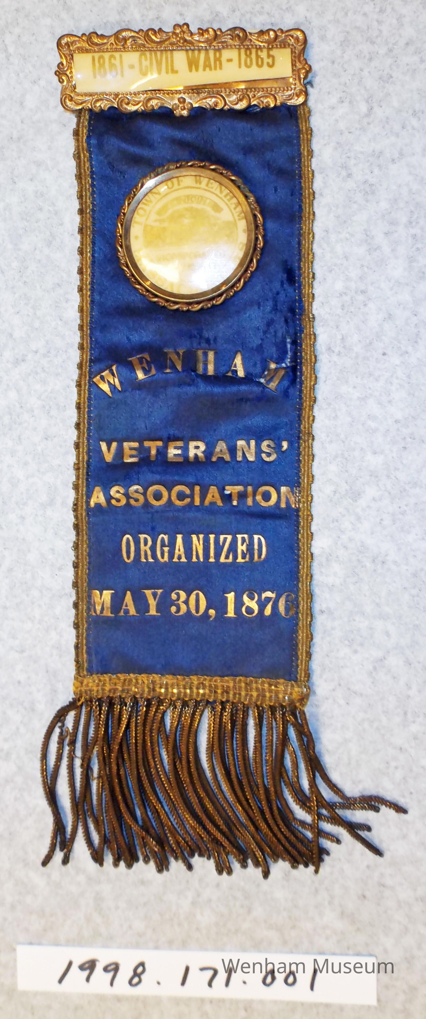 Bright blue silk Pin Badge commemorating the Civil War made up of a section of ribbon which is stitched to an ornate gilt pin. The pin forms a frame containing a laminated (?) strip of paper bearing the legend: "1861 - Civil War - 1865." The ribbon, which hangs straight down from the pin, is printed with gold ink. The words are as follows: "WENHAM Veterans' Association Organized May 30, 1876." The ribbon is edged with gold braid and finished with a bullion fringe. There is also a laminated badge which is stuck into the ribbon with two sharp metal points which have been peened over to hold it in place. The badge bears the Wenham town seal within a gilt rope edging. Given the 1876 date, this badge was possibly linked to the country's Centennial celebrations.