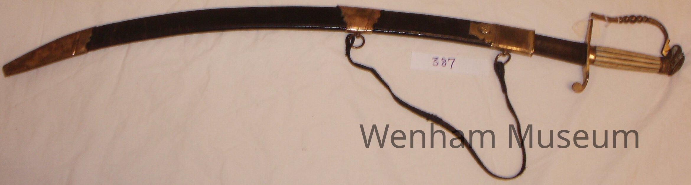 Sword. with scabbard. Carved ivory and vermeil hilt with eagle head. Steel sword blade, slightly curved, chased with pattern of oak leaves and acorns (?). Scabbard of dark-brown leather bound with decorative vermeil bands. Braided horsehair (?) handle on scabbard. Ceremonial rather than functional?