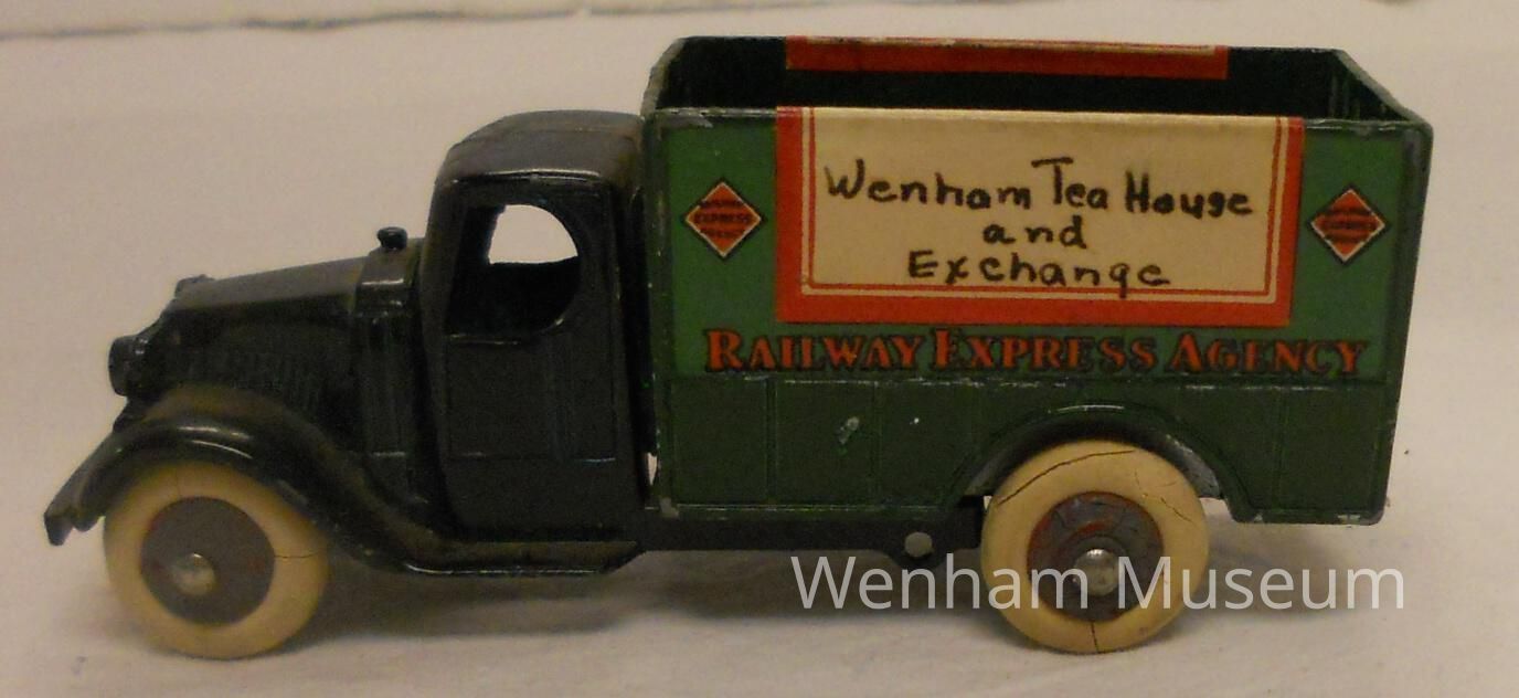 Toy truck with "Wenham Tea House and Exchange" sticker above "Railway Express Agency" sticker, manufactured by Tootsie Toy in the USA; metal cab painted in dark blue, back painted in dark green, symbol with a "M" that splits it with a line on the front, wheels are made of a synthetic material and are white and red, orginal sticker on both sides reads "RAILWAY / EXPRESS / AGENCY / ...[covered section].../ [MAILWAY / EXPRESS / AGENCY] / MAILWAY EXPRESS AGENCY", sticker that covers that section reads "Wenham Tea House / and / Exchange," bottom of toy reads "TOOTSIETOY / MADE IN / UNITED STATES OF AMERICA."