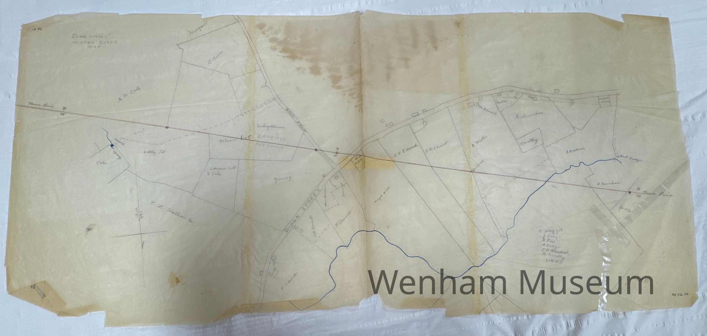 Water board map showing properties on town line between Wenham and Beverly along Grover Street and Dodge Street
