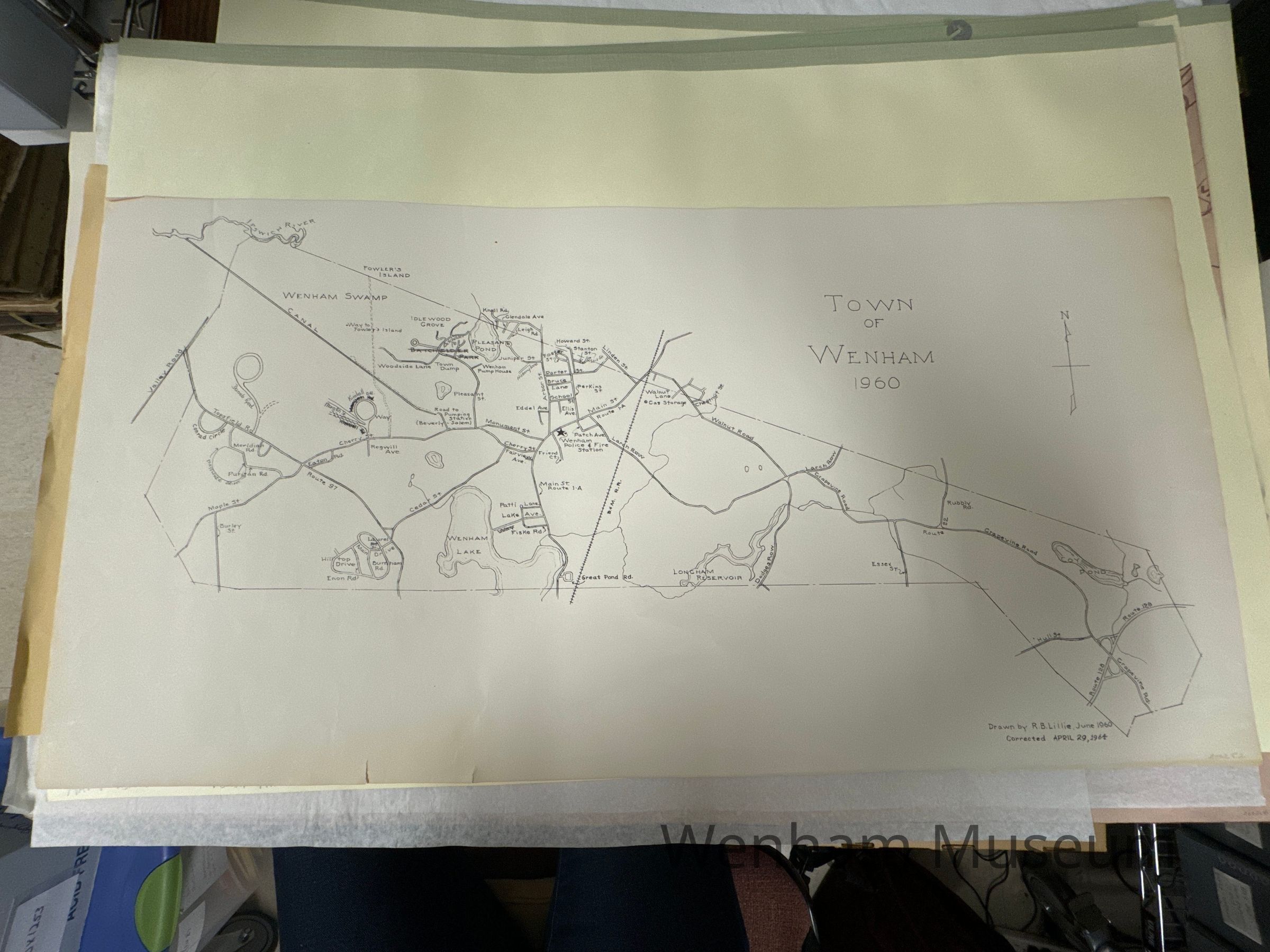 The records make it unclear if 2002.05.001 and 2002.05.002 are the same map or 2 different maps. See file Town of Wenham 1960 Drawn by Rupert B. Lillie June 1960 corrected April 20 1964
