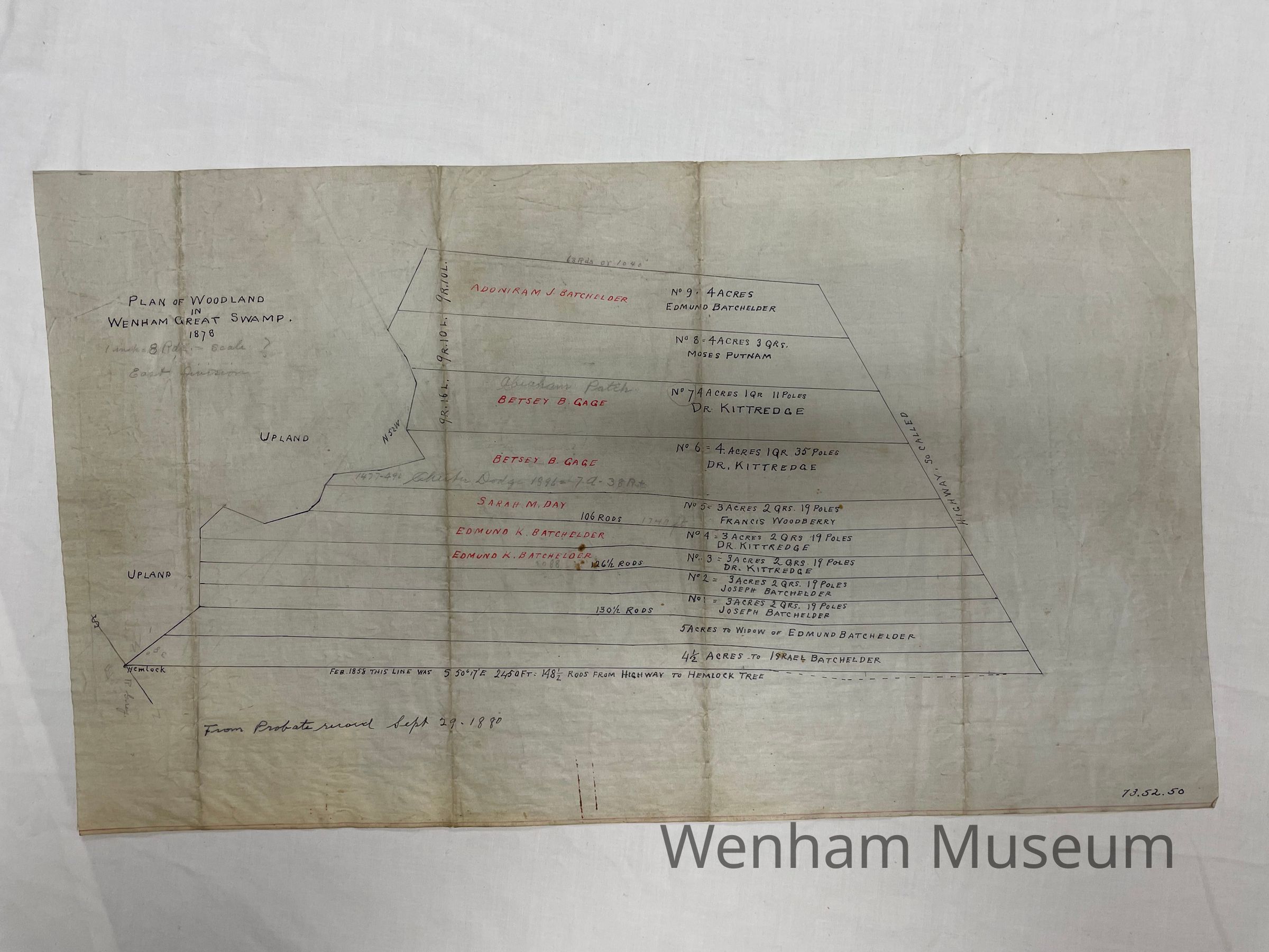 Woodland in Wenham, Great Swamp 1878 showing plot lines and owners names. The size of the plots are noted in poles and acres. The map notes "From Probate Record Sept. 29, 1880". The map was probably drawn by Louis A. Dodge in the 1940s.