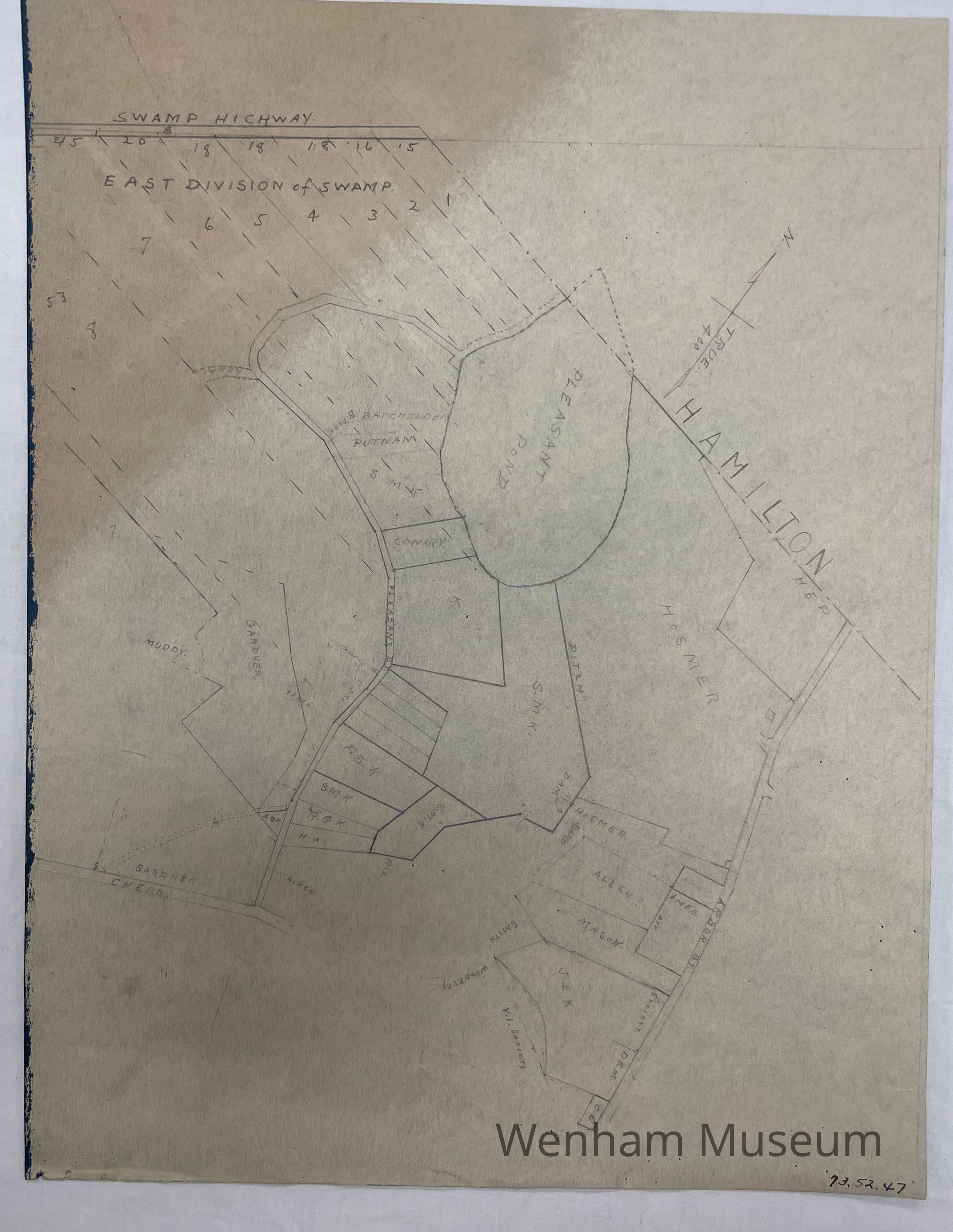 Undated map showing a section of Wenham bounded by Cherry Street, Arbor Street, Swamp Highway and the Hamilton line. Plot lines are drawn on the map and some names.