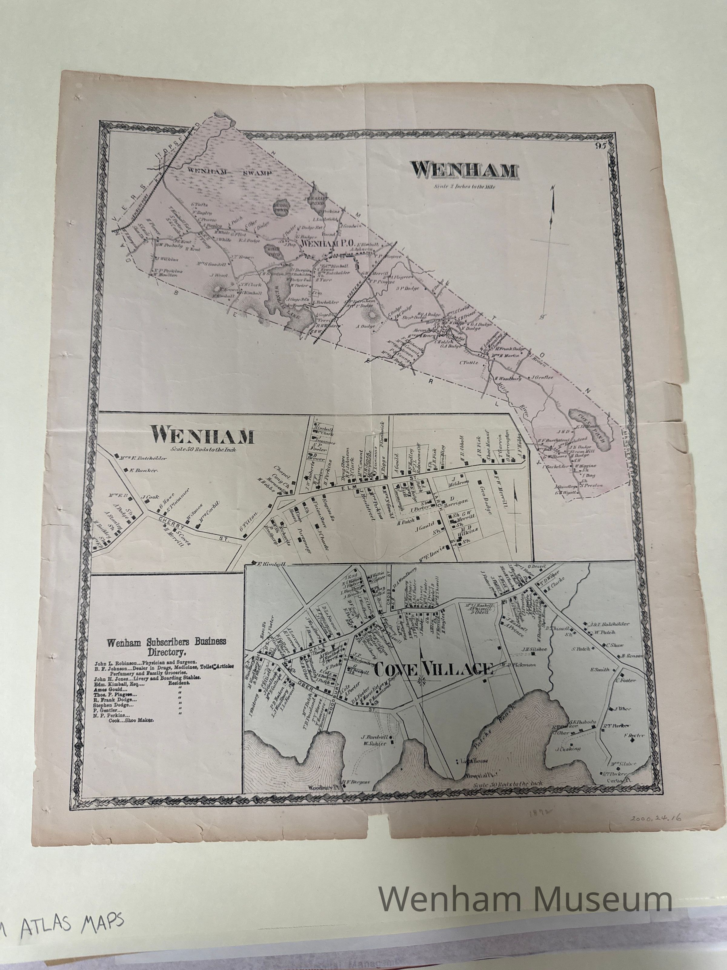 Map of Wenham and Cove Village (in Beverly). The whole town of Wenham is shown as well as an enlargement of the town center. The names of residents is noted next to houses and there is a list of Wenham business subscribers and some residents.