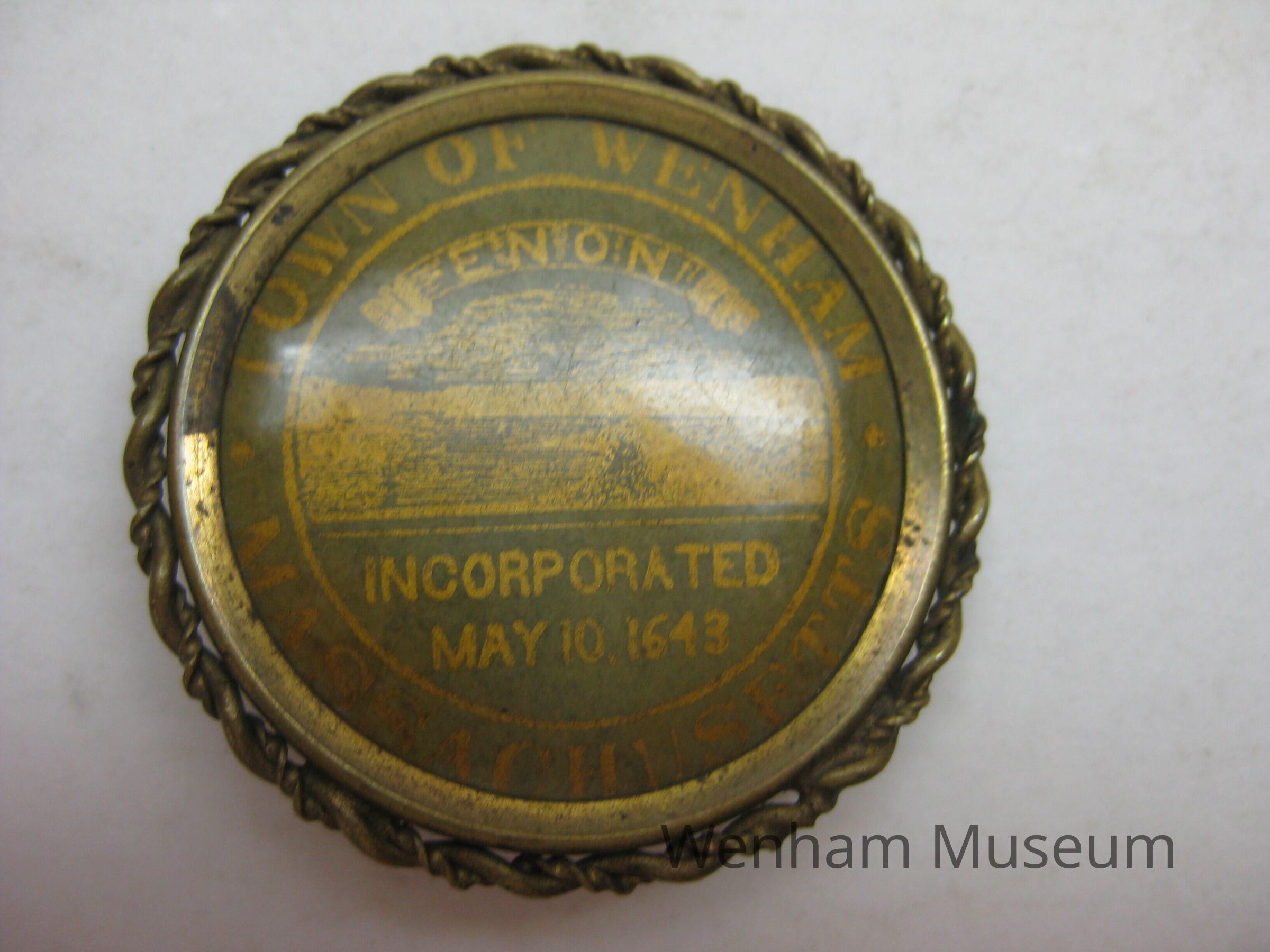 A round badge, a Wenham memento, with a thin rope edge, 1.625" in diameter, brass color, printed with: "Town of Wenham, Massachusetts - Enon - Incorporated May 10, 1643." On the back is a manufacturer's(?) label: A. R. Lopez & Sons, School Street, Boston, Mass."