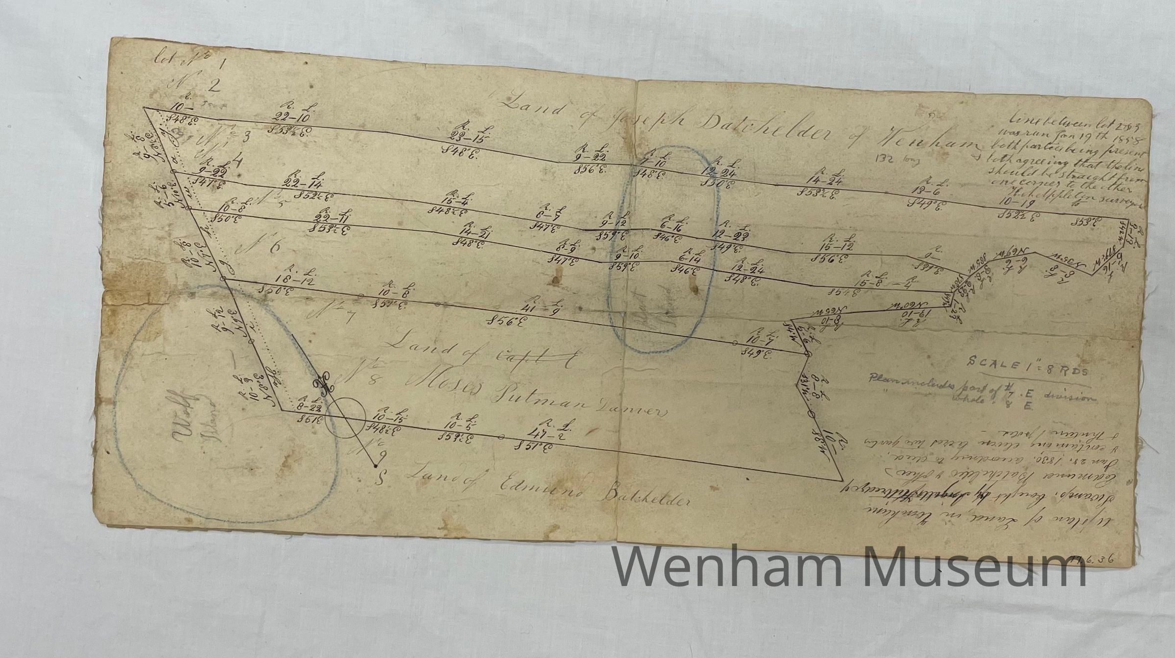 19th century plan of land in Wenham Swamp showing owners Ingalls Kittredge and Edmund Batchelder and others. The property was purchased January 28, 1830 according to deed. The plan also notes lines "...run Jan 19th 1858".