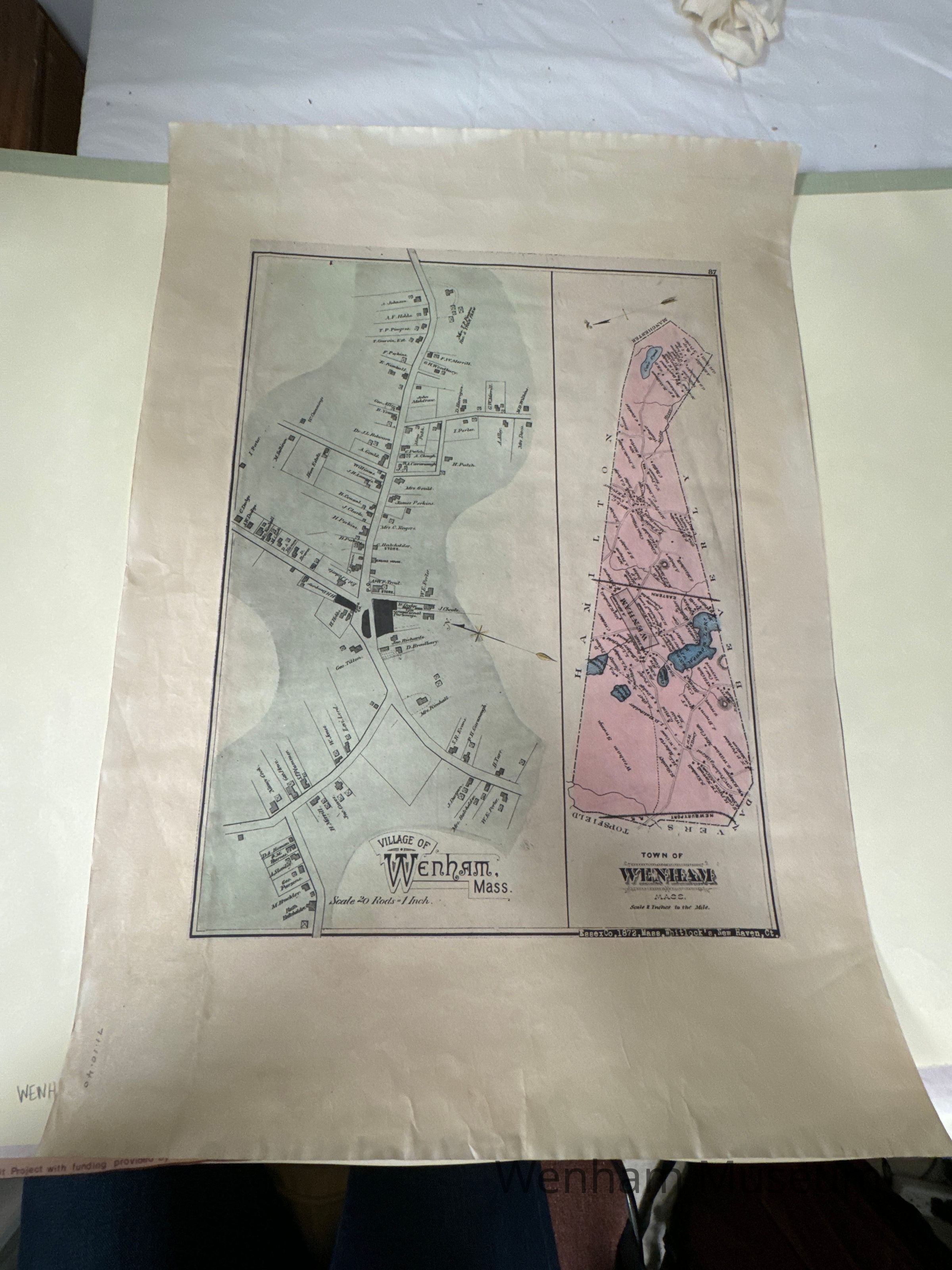 Village of Wenham/Town of Wenham 1872, the right side of the map shows the whole town, the left is an enlargement of the town center. The names of the residents are noted next to their homes.