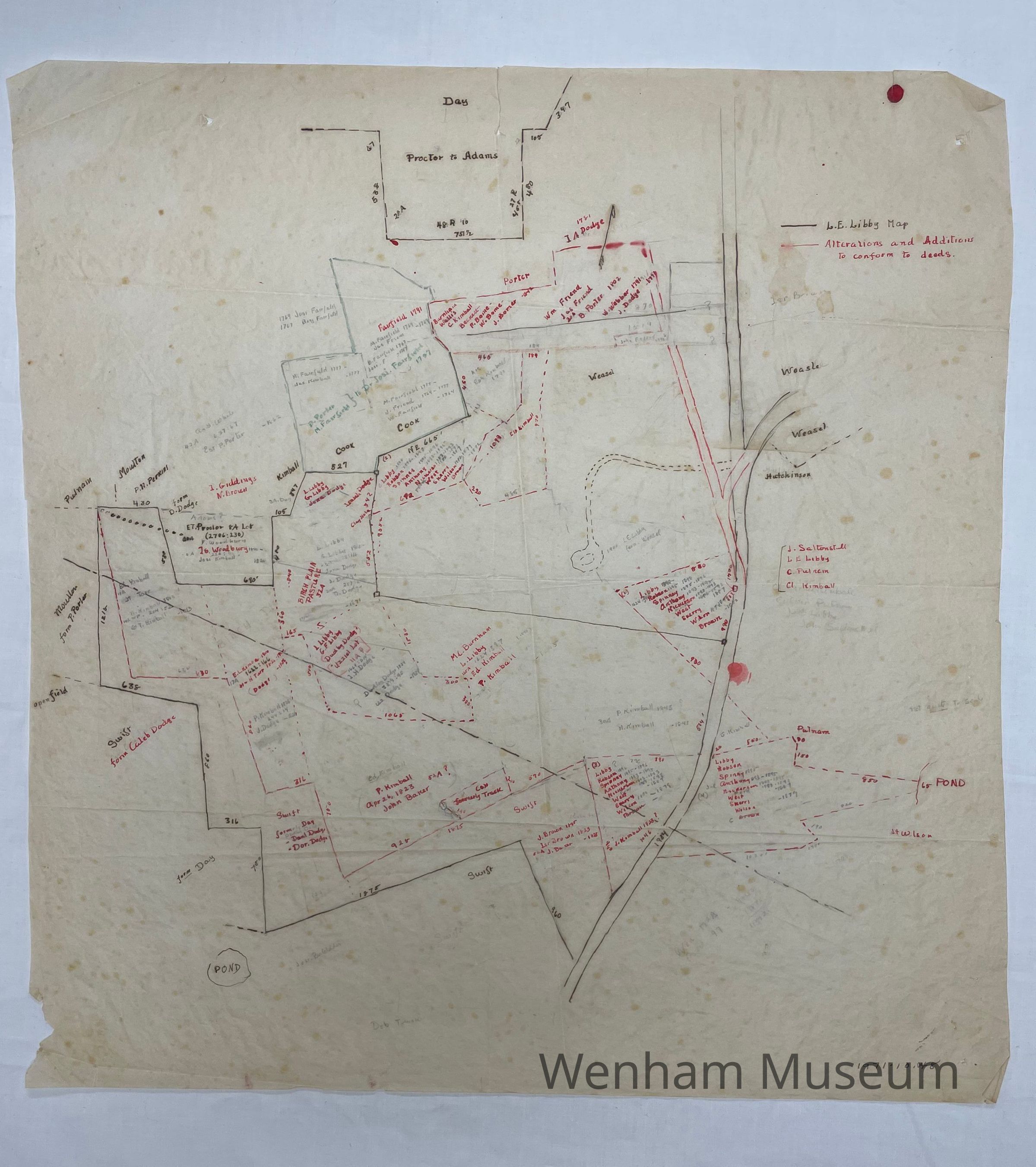Undated map of Wenham, West End by L.E. Libby showing plot lines and names of past owners. A note in red ink in the upper right says "Alterations and Additions to conform to deeds." Some of the lines are drawn in black ink and others in red ink. Next to some of the names are dates- most are 19th century dates, but there a some 18th century dates as well.