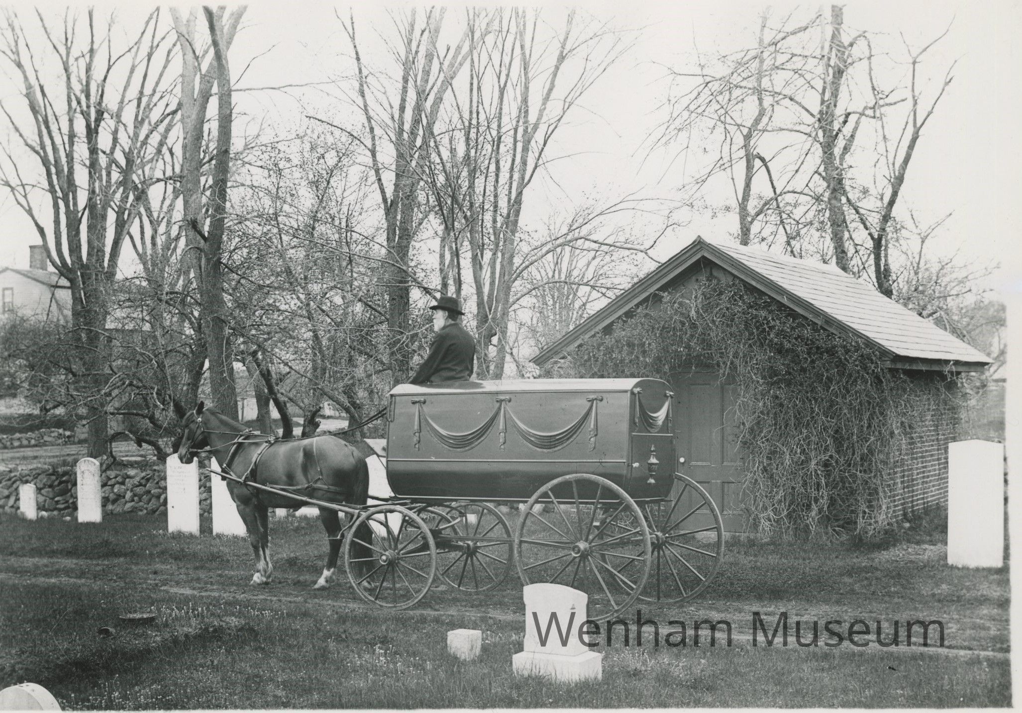 Wellington Pool, Sexton, with hearse at Wenham Cemetery, Main St., Wenham, Mass. Black and white print of plate #0472, Date: May 13, 1892