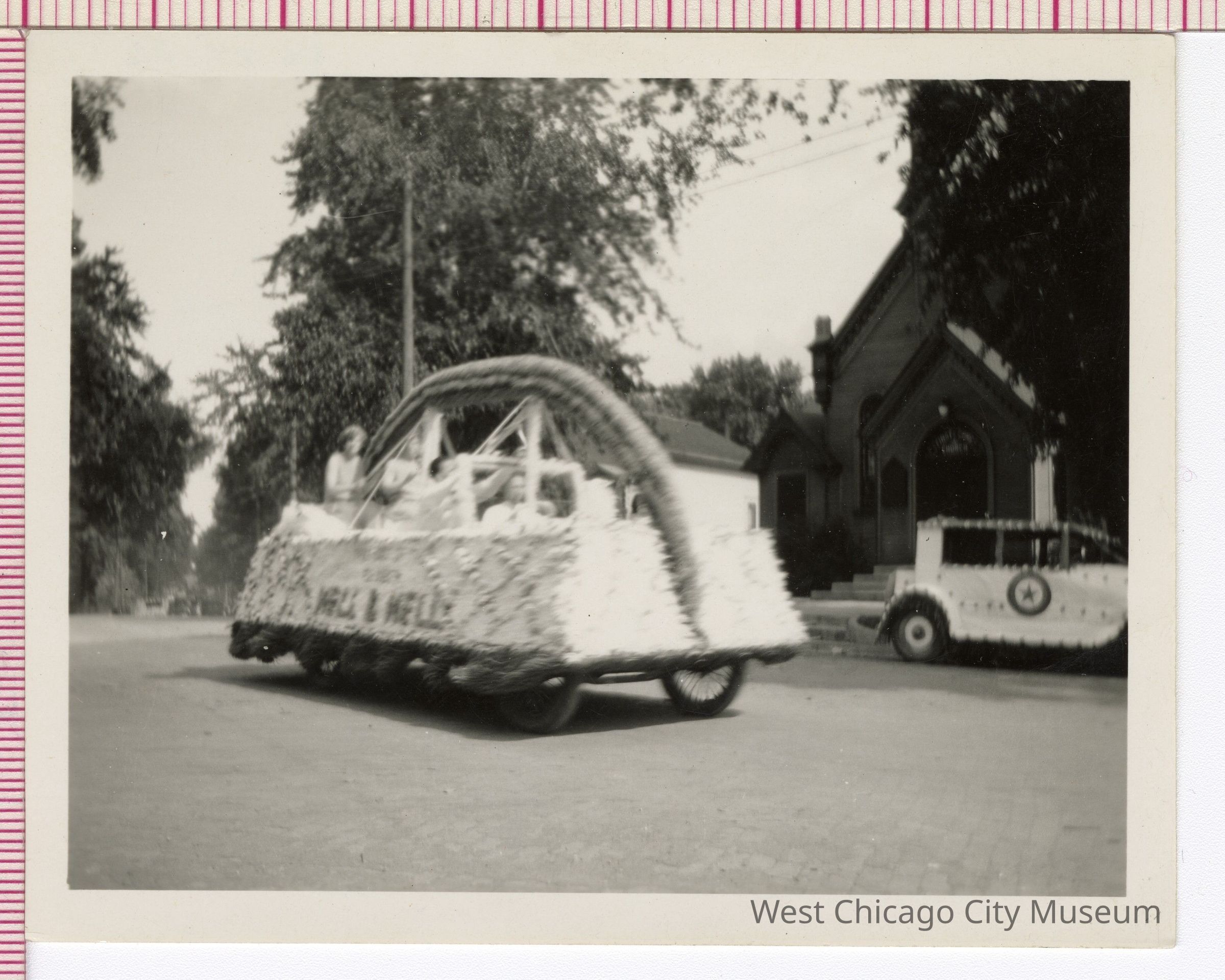 Photograph: Mell & Mell Float in front of Congregational Church; 4 1/2 x 3 1/2"Photograph Details