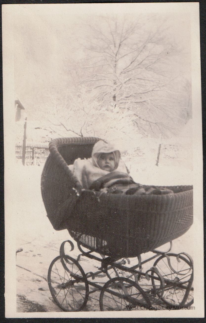 Photograph, Black and white, portrait orientation, showing Arleen Alexander as an infant in a wicker baby buggy bundled up in front of a snow covered tree. There is snow on the ground. The photo is pasted on black scrapbook paper. From series of photos with information "First real snowstorm Jan 4, 1923". From the Alexander family album