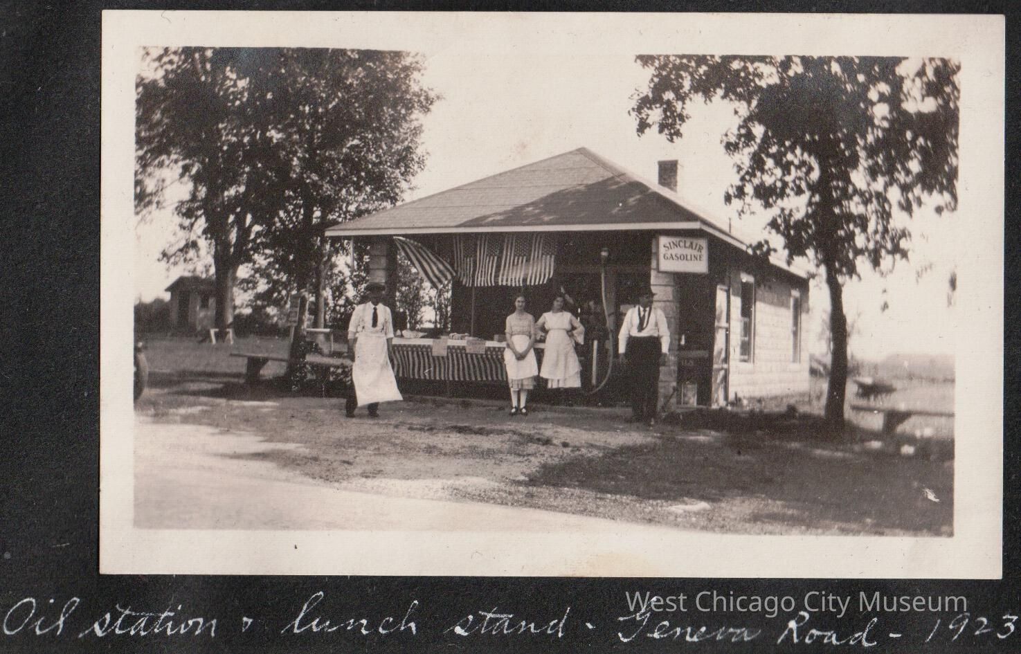 Photograph showing the Sinclair gasoline station and Oil station with a lunch stand on Geneva Road (possibly in West Chicago, but not certain) in 1923. The small square building has American flags hanging front the porch roof, and there are 2 people standing on front - two men (one in and apron) and two women (both in aprons). The is possibly an outhouse on the far left of the photo, behind a tree.