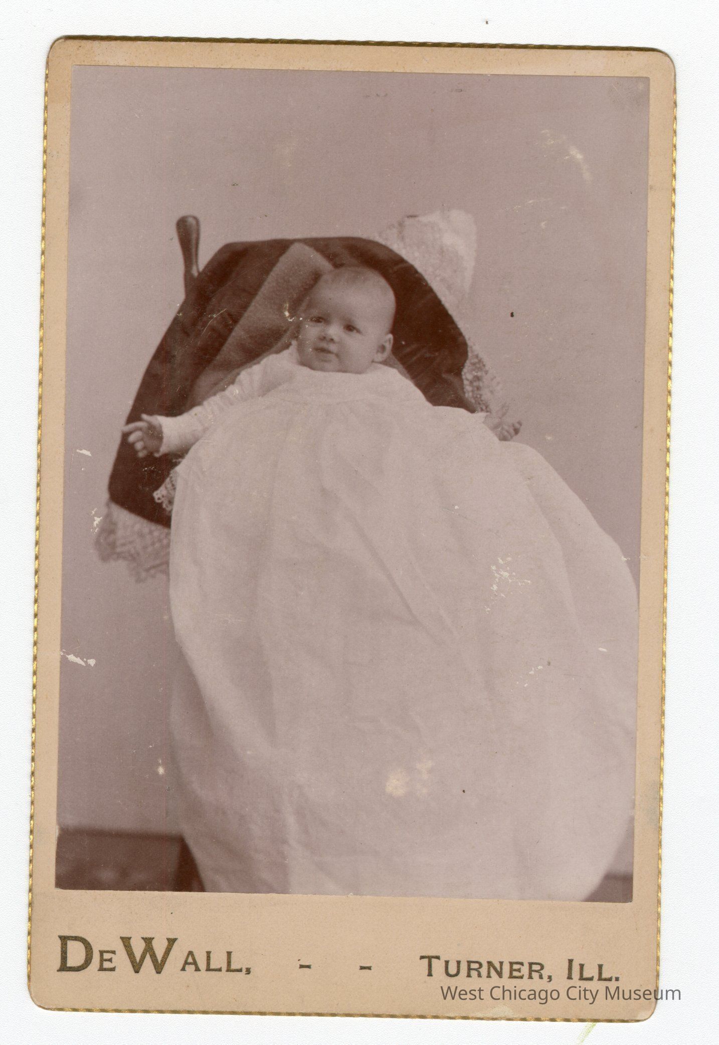 Photograph: Ruth Barfield Creager: Photograph; sepia on white backing with gold trim and black lettering that reads "DeWall, Turner, ILL." portrait of baby in long gown on chair; "Ruth Barfield Creager, 5 months" written in cursive on back side; back side is pink; Good condition: minimal wear throughout; Dimensions: 4"x 6.5"Photograph Details