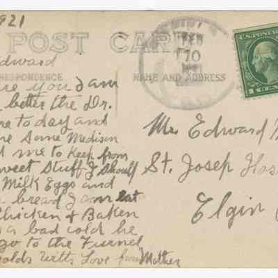 Photographic postcard. Caption reads, "North Street Towards [?], West Chicago, Ill." On reverse is a one cent George Washington stamp, a postal cancellation which is blurred, but "Feb 10" can be seen. Address reads, "Mr. Ed. Nagel St. Joseph Hospital, Elgin Ill" and a script which reads, "Feb 9 = 1921