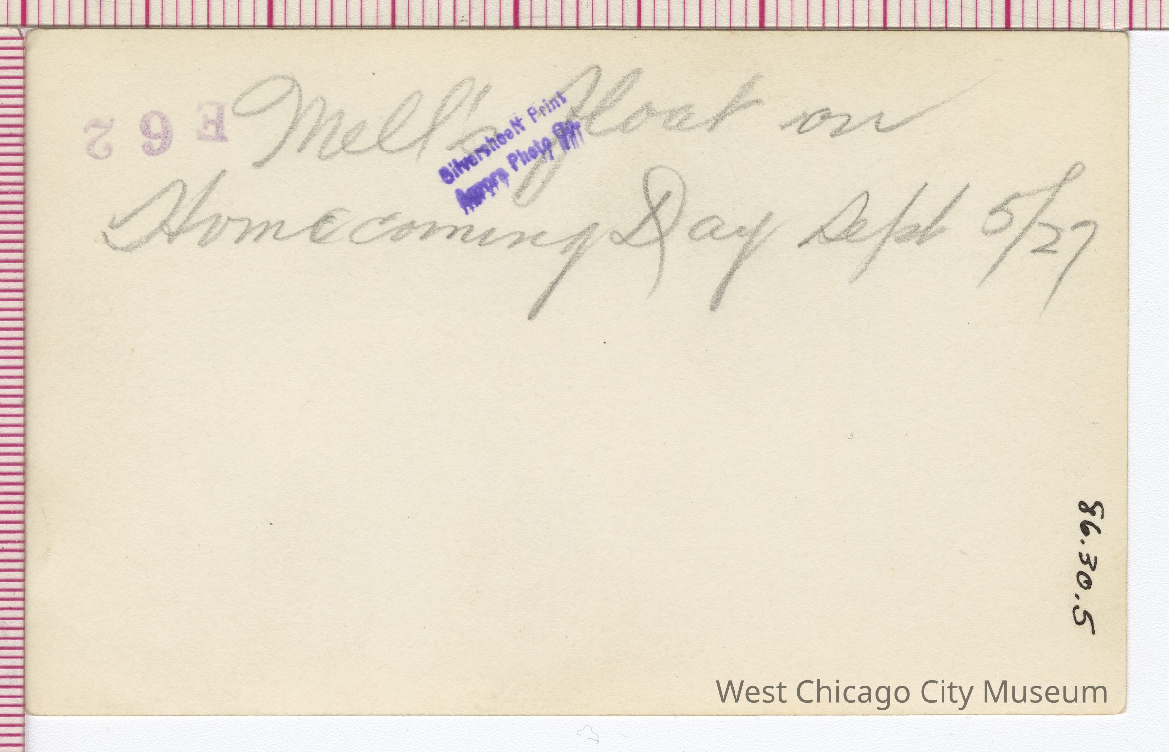 photographs of May, 1927 Homecoming Parade in West Chicago (Mell's Float)