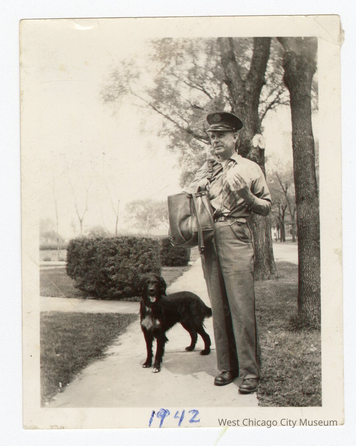 Photograph: Herbert Carlson; Photograph; black and white; with white border; man with dog; "Herb Carlson" written in pencil on back side; Dated: 1942, written in blue pen on front side; Good condition: some wear and discoloration visible throughout; Dimensions: 3.5"x4.5"Photograph Details
