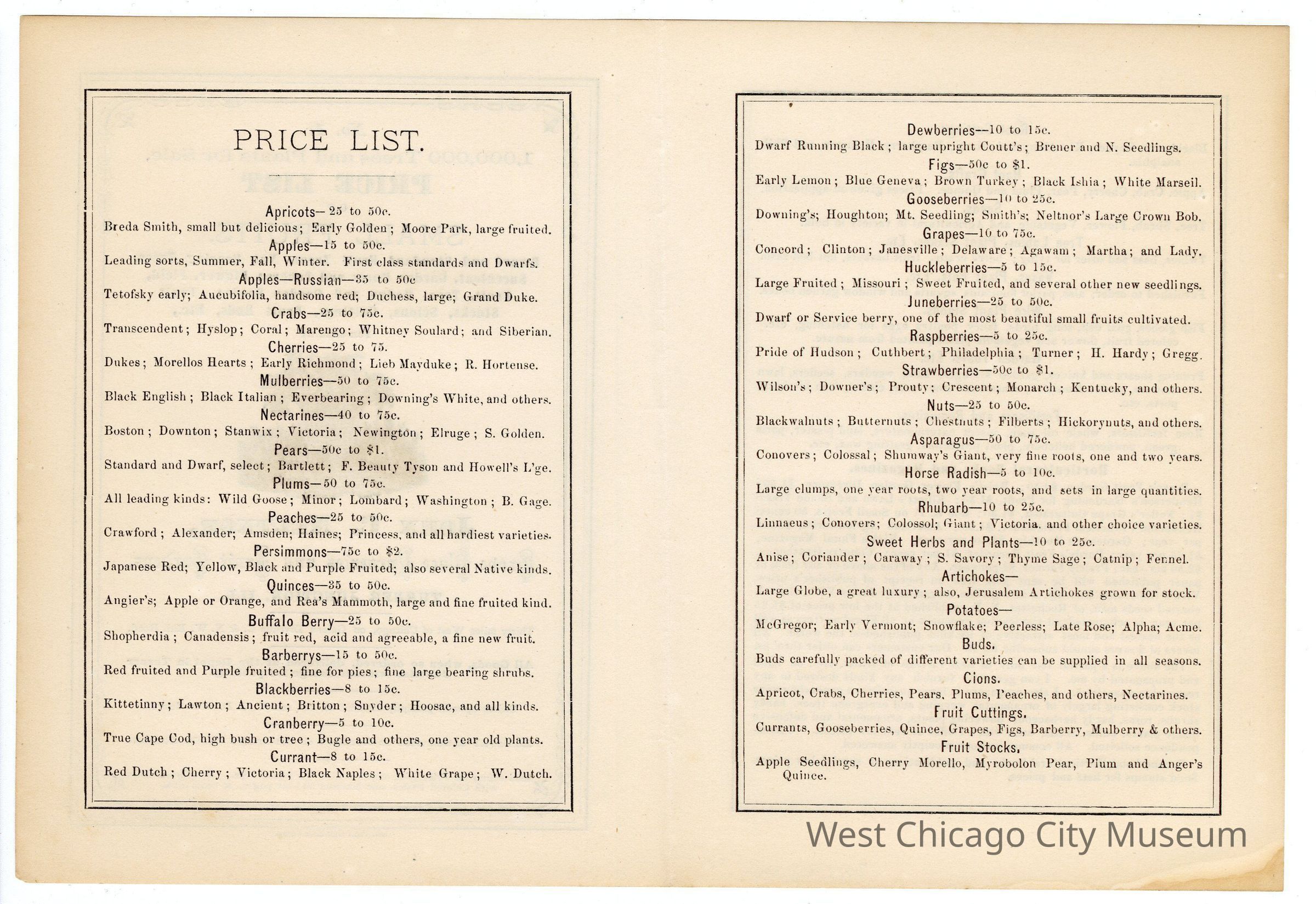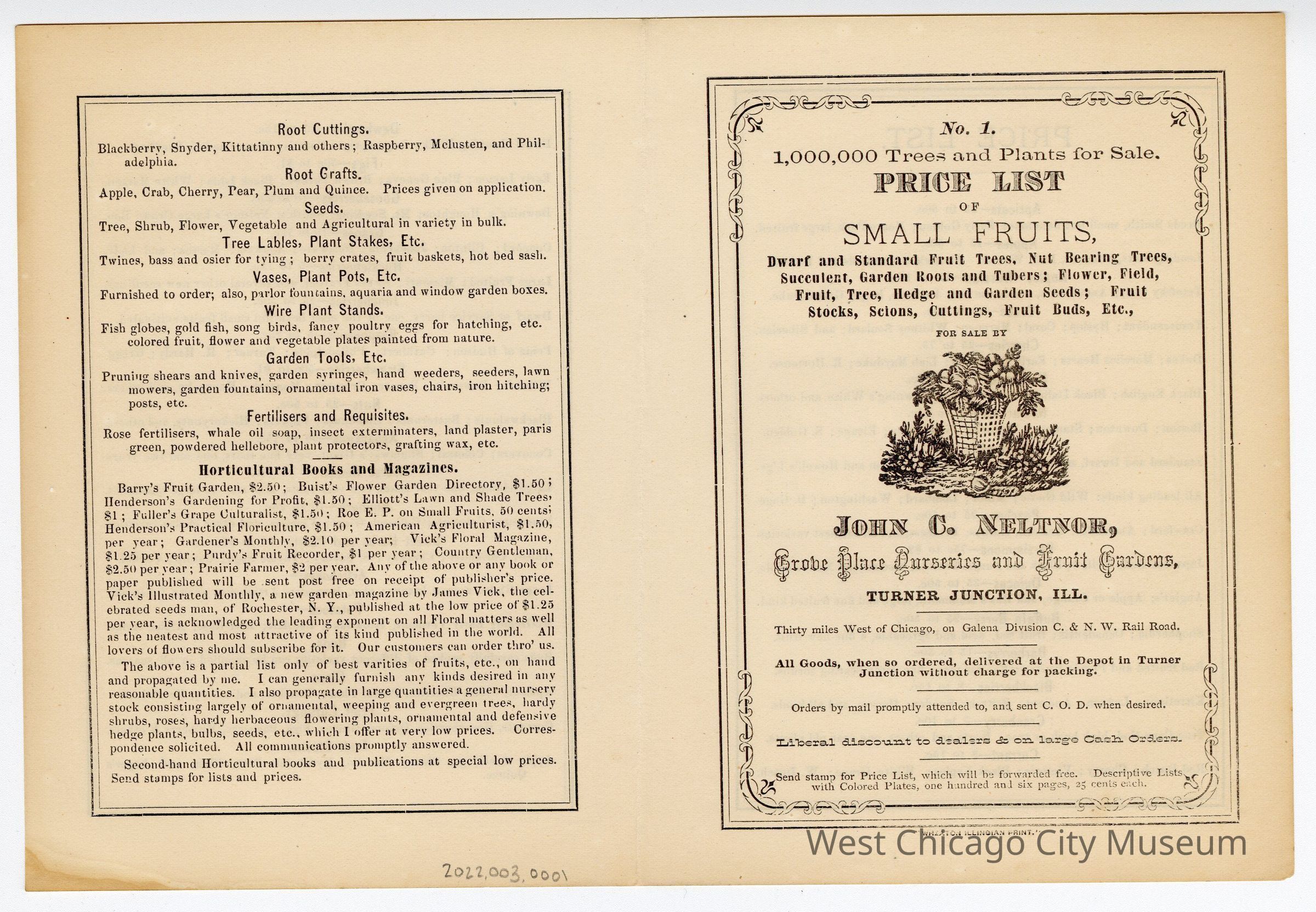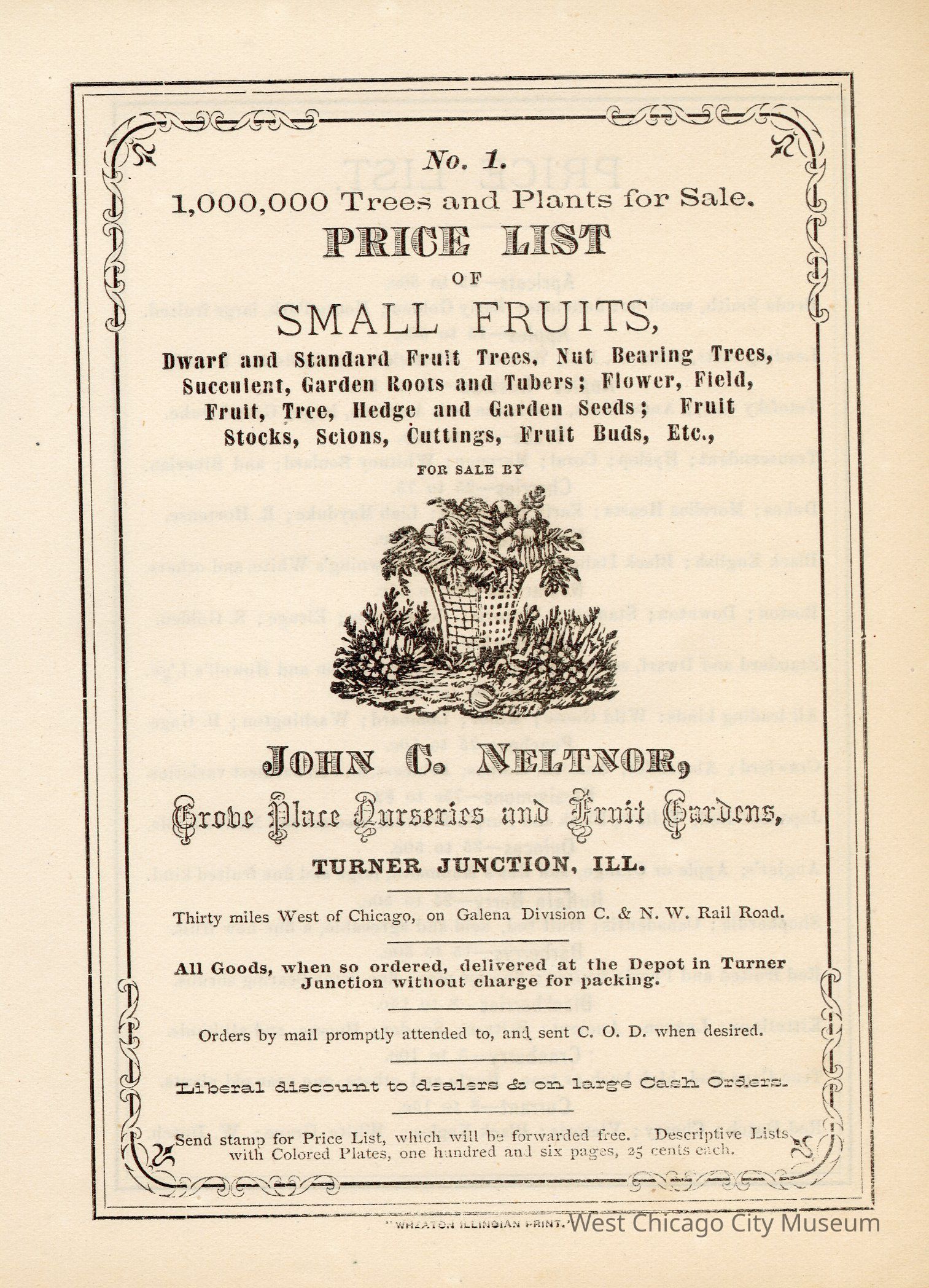 General Pricelist for small fruits, provided by John C. Neltnor of Grove Place Nurseries and Fruits Gardens of Turner Junction, ILL. The small pamphlet advertises the larger price list or catalog or over 1,000,000 trees and plans for sale, which interested parties would send a stamp to receive.