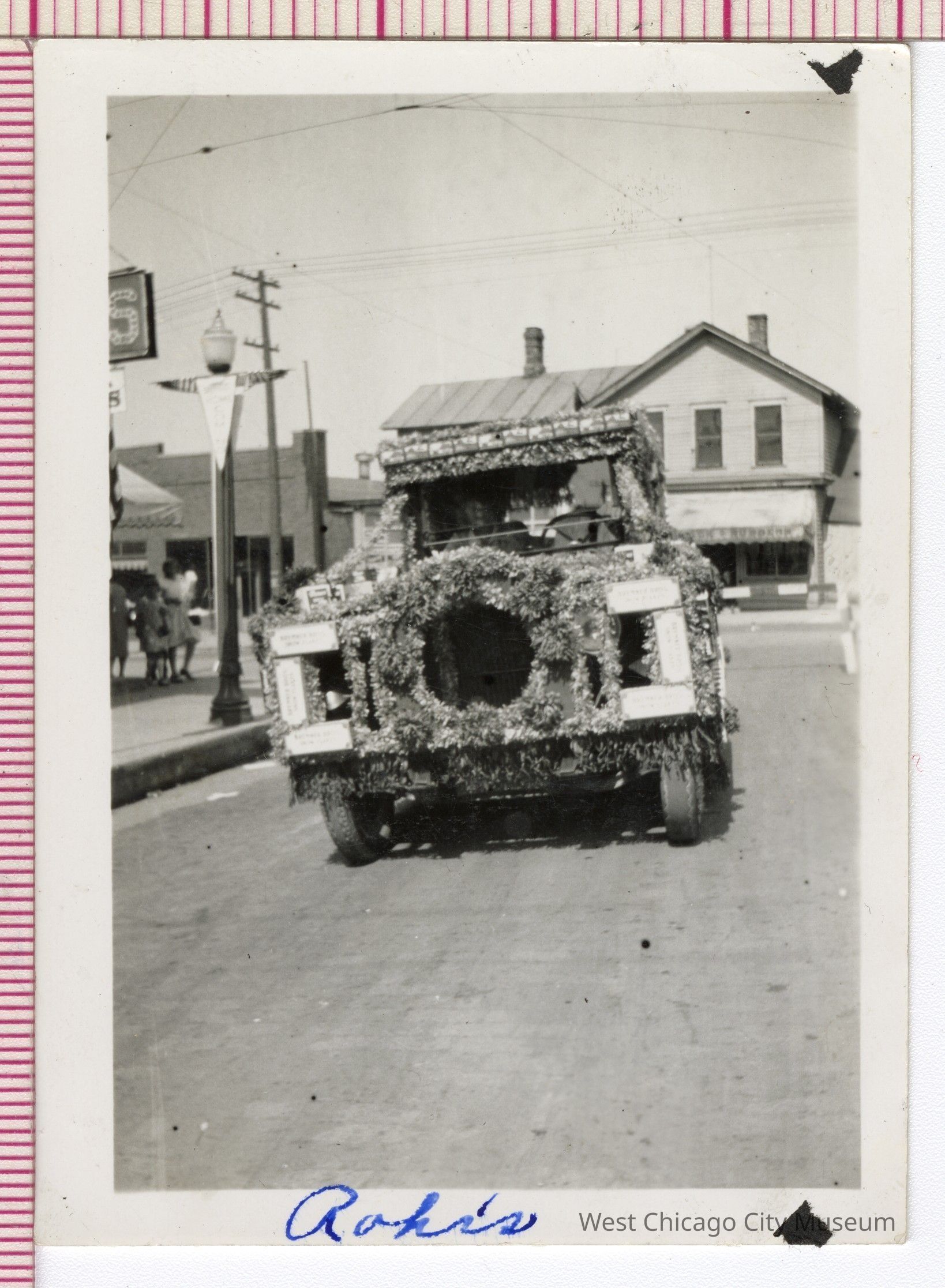 Photo, B&W: Annual Homecoming Day, September 5, 1927: Rohr's float going south on Depot Street. Nack's Shoe Store is in right background. "Rohr's" is written in blue ink on bottom border. 2 9/16" w x 3 1/2" hPhotograph Details