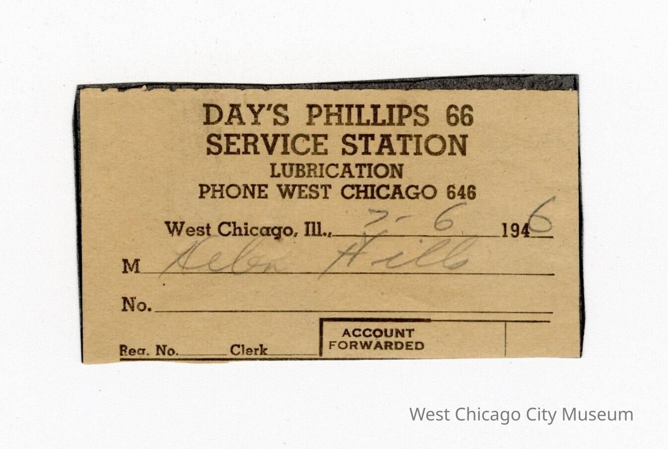 Top of a receipt for Day's Phillips 66 Service Station. The customer was Helen Hills, date of service was 7/6/1946. The bill was cut; it's only the letterhead that was saved.