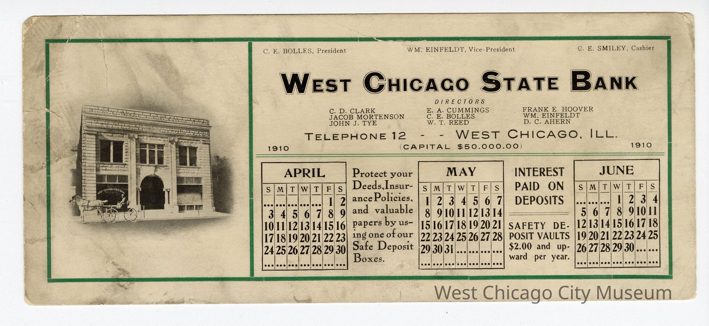 Blotter, Calendar, West Chicago State Bank 1910, April - June, C. E. Bolles (President), W.M. Einfeldt (Vice President), C. E. Smiley (Cashier), Directors: C. D. Clark, Jacob Mortenson, John J. Tye, E. A. Cummings, C. E. Bolles, W. T. Reed, Frank E. Hoover, W. M. Einfeldt, D. C. Ahern, Telephone 12Collection