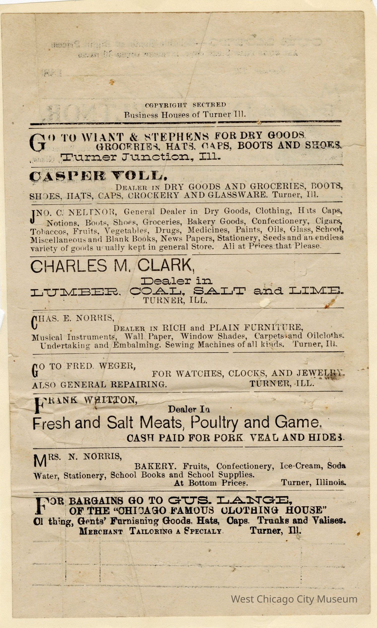 Page from book-Business Houses of Turner, Ill.-lists several businesses in Turner, Ill. 8" h x 4 3/4" w, white with black ink glued to white paperCollection