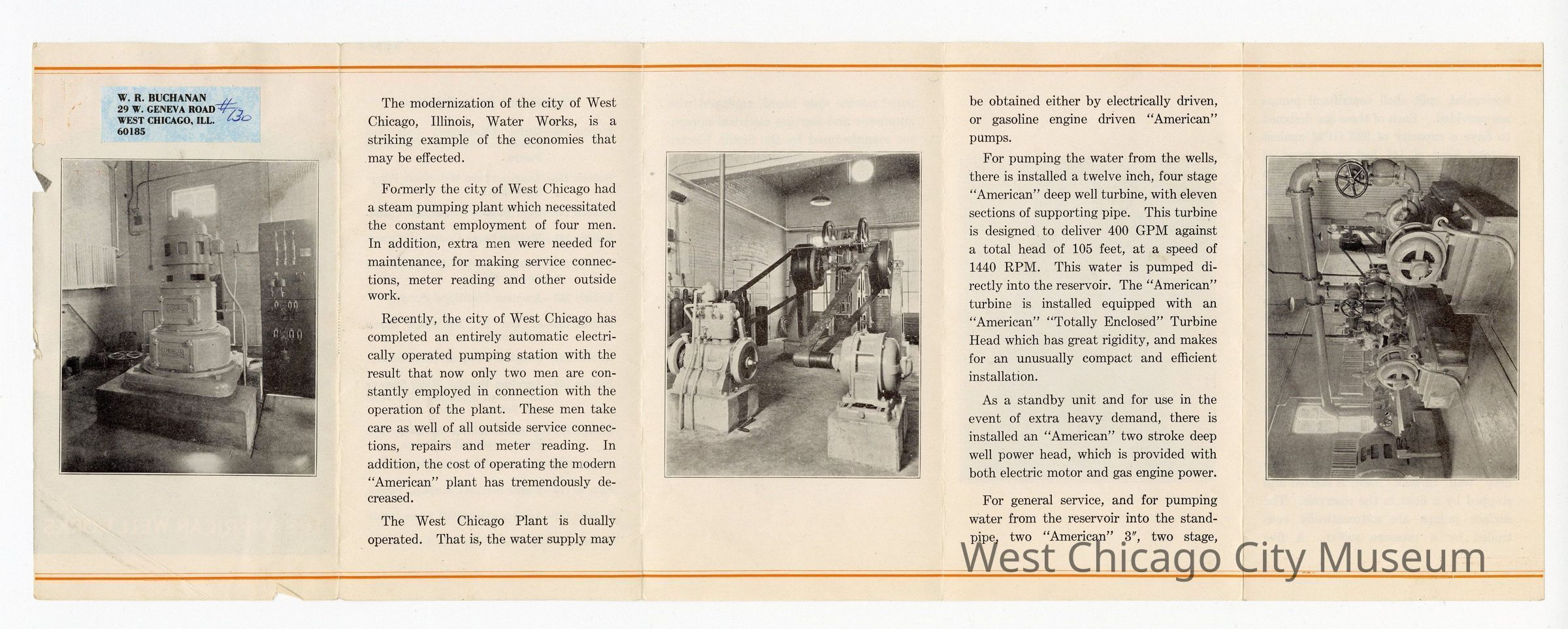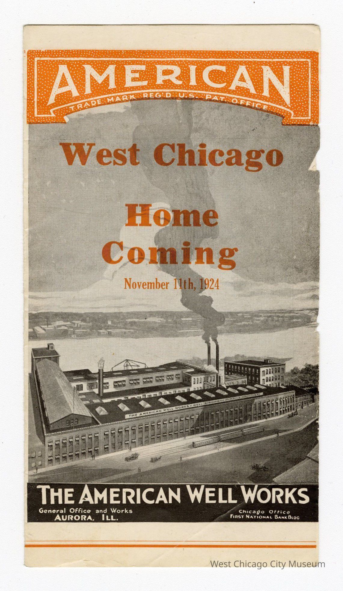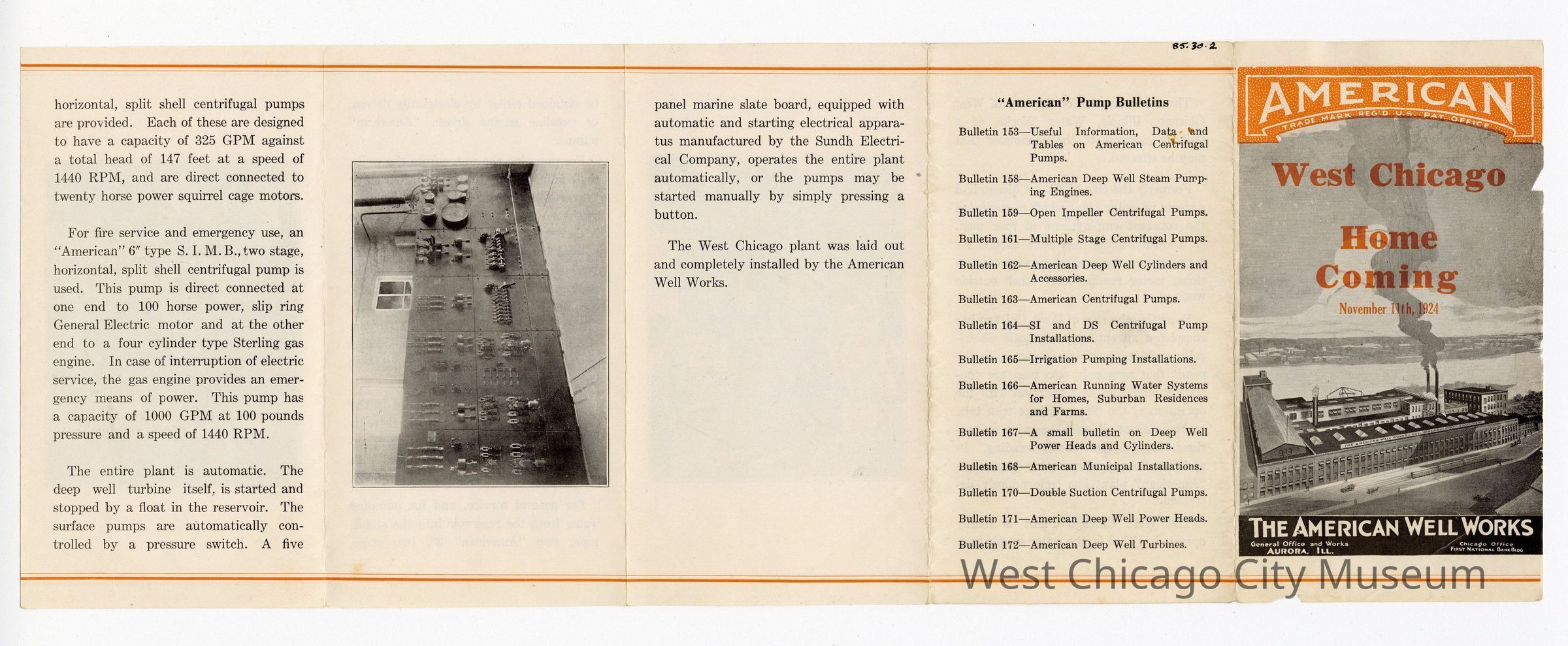 Brochure: American Well Works of Aurora, Ill. On the occasion of Nov. 11, 1924 West Chicago Home Coming; 10 panel brochure; brochure explains the new West Chicago equipment installation by American Well WorksCollection