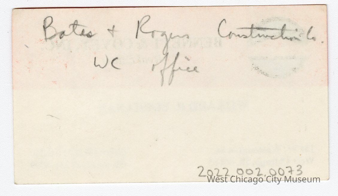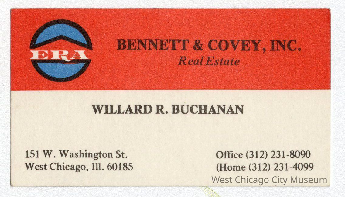 Business Card for Willard R. Buchanan, employee of Bennett & Covey, Inc, Real Estate, located at 151 W. Washington St., West Chicago. Red stripe across the top, white on bottom with blue and white "ERA" logo upper left. On the back is a note in pencil that reads "Bates & Rogers Construction WC Office"