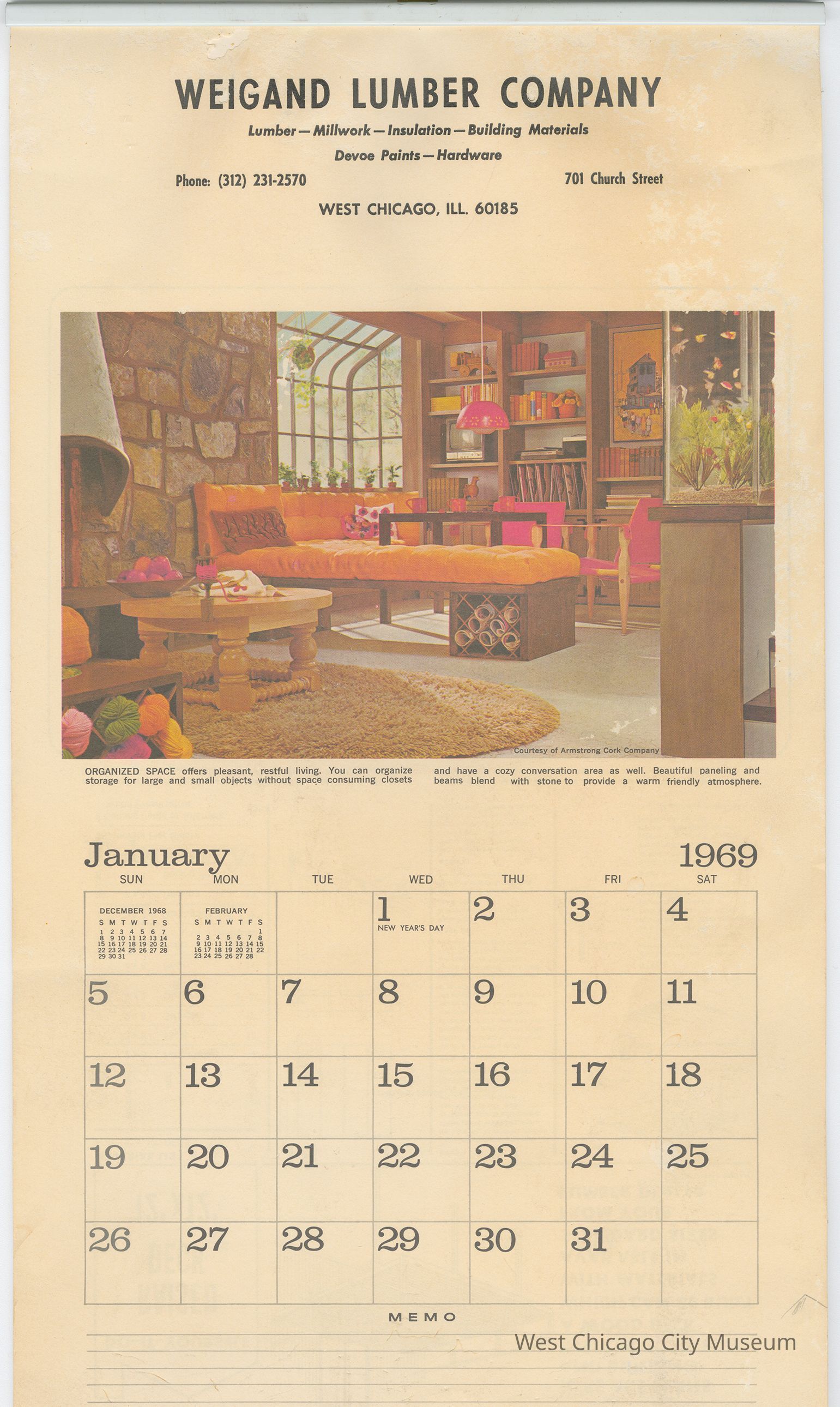 Wall Calendar, 1969, from Weigand Lumber Company, 701 Church Street, West Chicago. Consists of oversized sheets (17.5" tall, 10 " wide), one page per month. Front side of each page has a image of a modern looking space home, or project (some with simple plans), and bottom half has the month's calendar. Backside of the page has a gray print of DIY plans for household improvements, house plans or advice. December has a note at bottom that you can order any of the house blueprints on the pages - set of 4 for $59, 1 set for $25. Calendar is unused.Lexicon