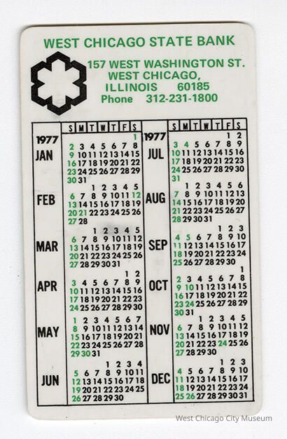 1977 Calendar, printed on a plastic card, 2.25 x 3.75", from the West Chicago State Bank. White with black and white print. One side has larger 1977, reverse has smaller June- Dec 1976 and Jan-June 1978.Lexicon