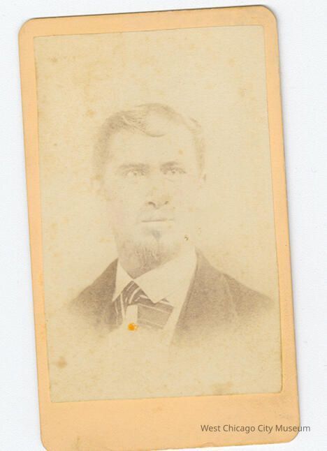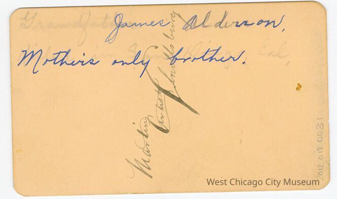 Carte-de-visite, showing a man in a suit with medium colored hair, brushed back on the sides. He has a goatee, possibly a mustache. He has an oversized bowtie, angled down, almost like a cravat. The photographer signed the back "Martin Artist Shullsburg" (Shullsburg, WI." In pen is written "James Alderson / Mother's only brother." Erase wording underneath reads "Grandfather Alderson / ____ in San Diego, Cal."Photograph Details