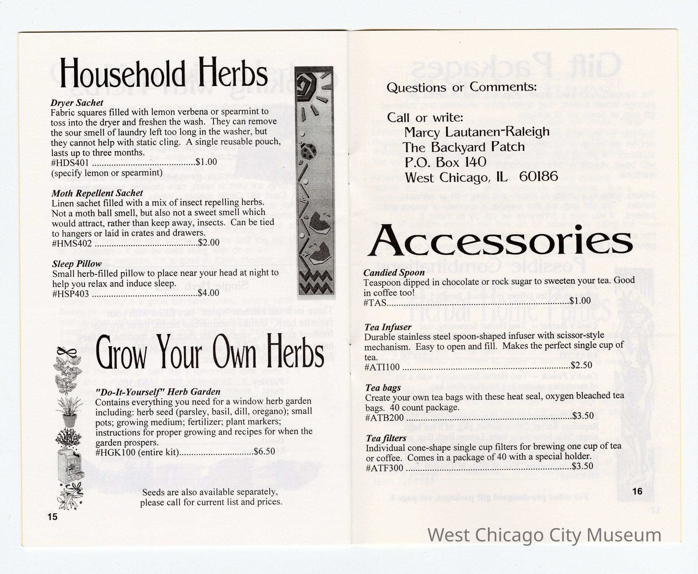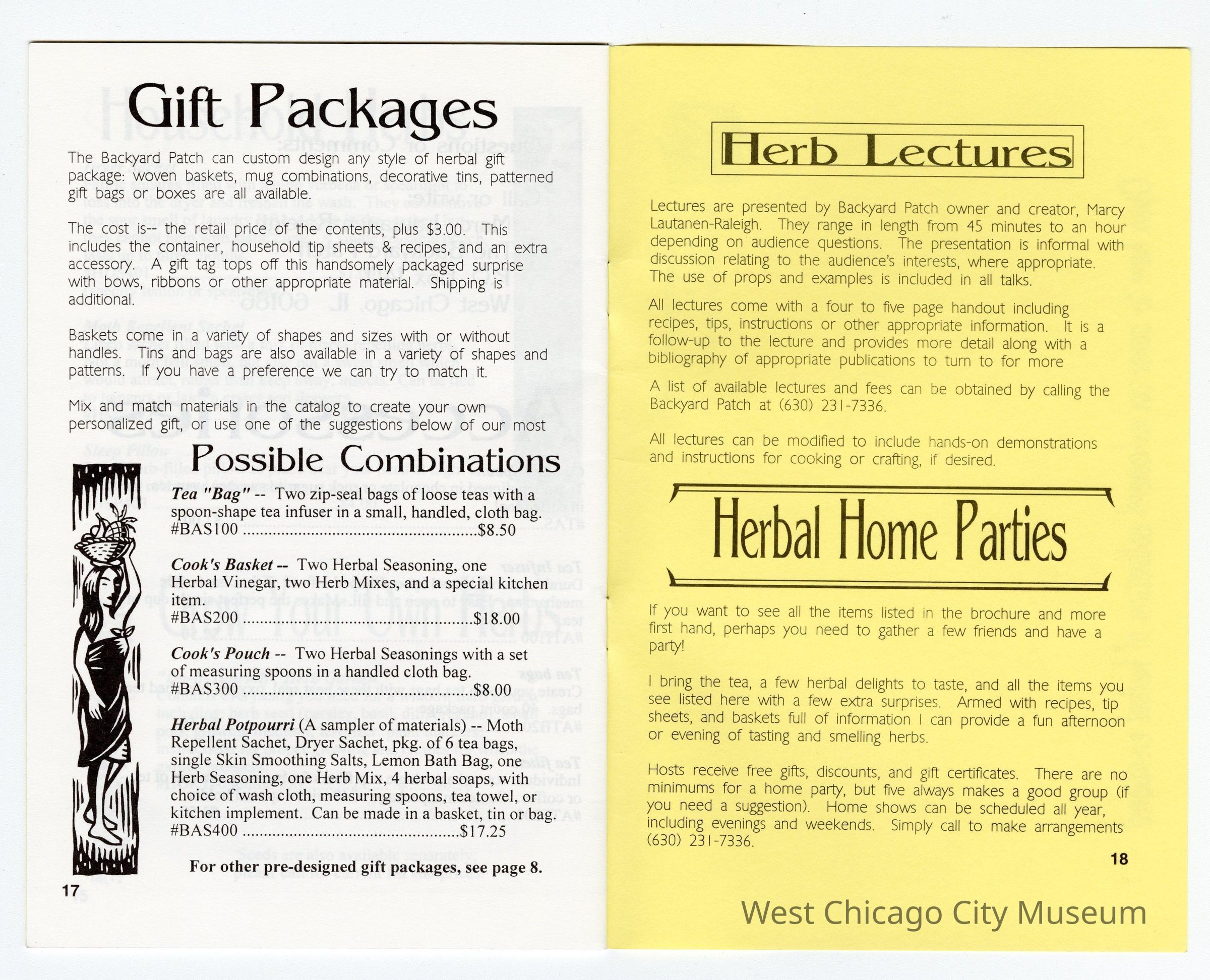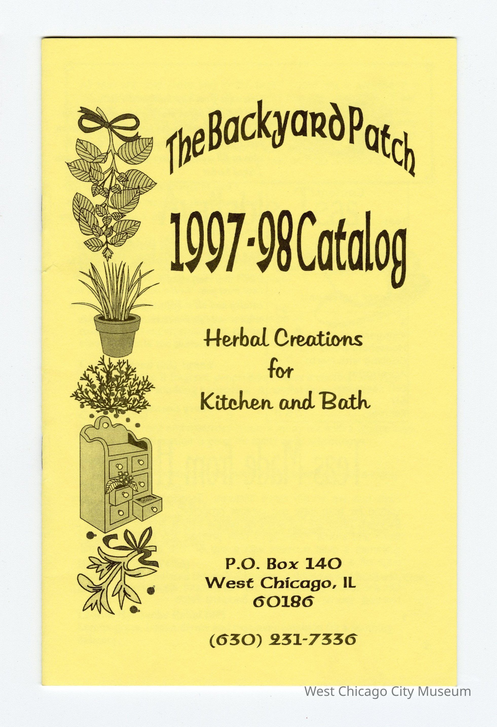 Booklet-The Backyard Patch 1997-98 Catalog-Herbal Creations for Kitchen and Bath W.C., 18 pages. Drawing of herbs along left side of front cover. Bright yellow cover with white pages and black print, 5 1/2" x 8 1/2".Collection