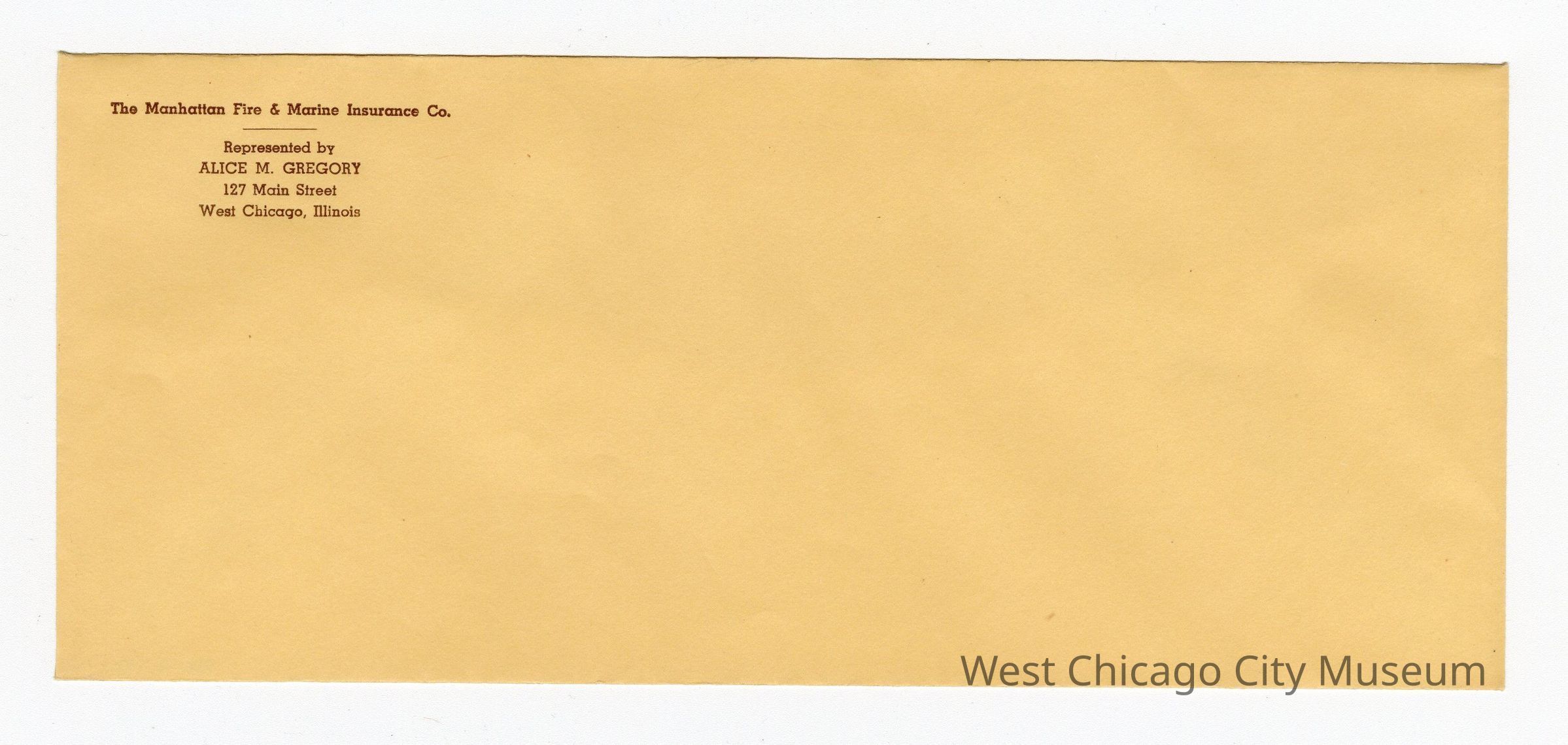 Envelope: front Alice M. Gregory, Agent The Manhattan Fire & Marine Insurance Co. 127 Main Street