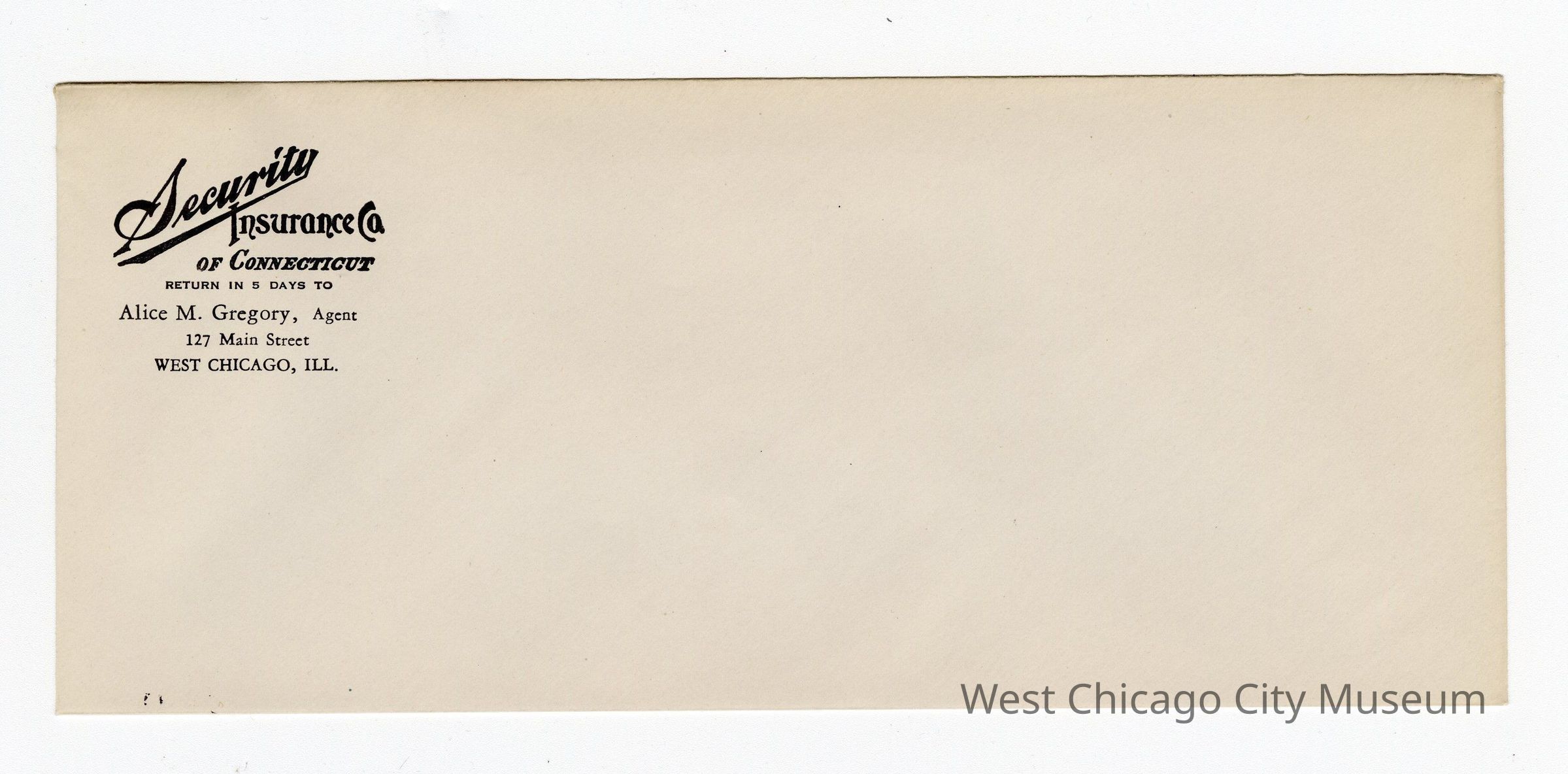 Envelope: front Alice M. Gregory, Agent Security Insurance Co. of Connecticute 127 Main Street